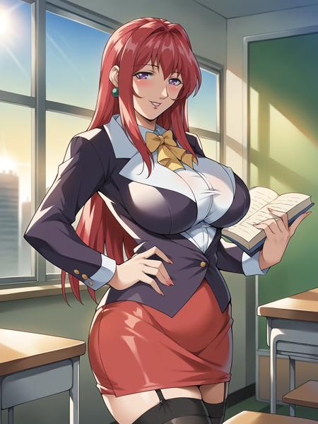 Takashiro Hiroko, 1girl, mature female, purple eyes, long hair, red hair, earrings,teacher, blouse, bowtie, blazer, taut skirt, red skirt, black thighhighs, garter straps, high heels,curvy, large breasts, thighs