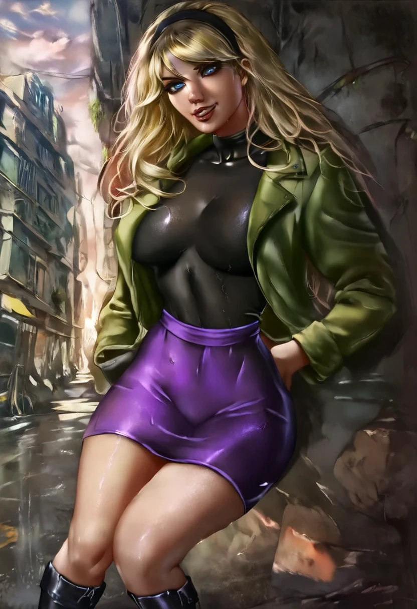Gwen Stacy, 1girl, solo, long hair, blue eyes, blonde hair, jacket, hairband, boots, black footwear, open jacket, black shirt, makeup, knee boots, black hairband, green jacket, medium breasts, purple skirt