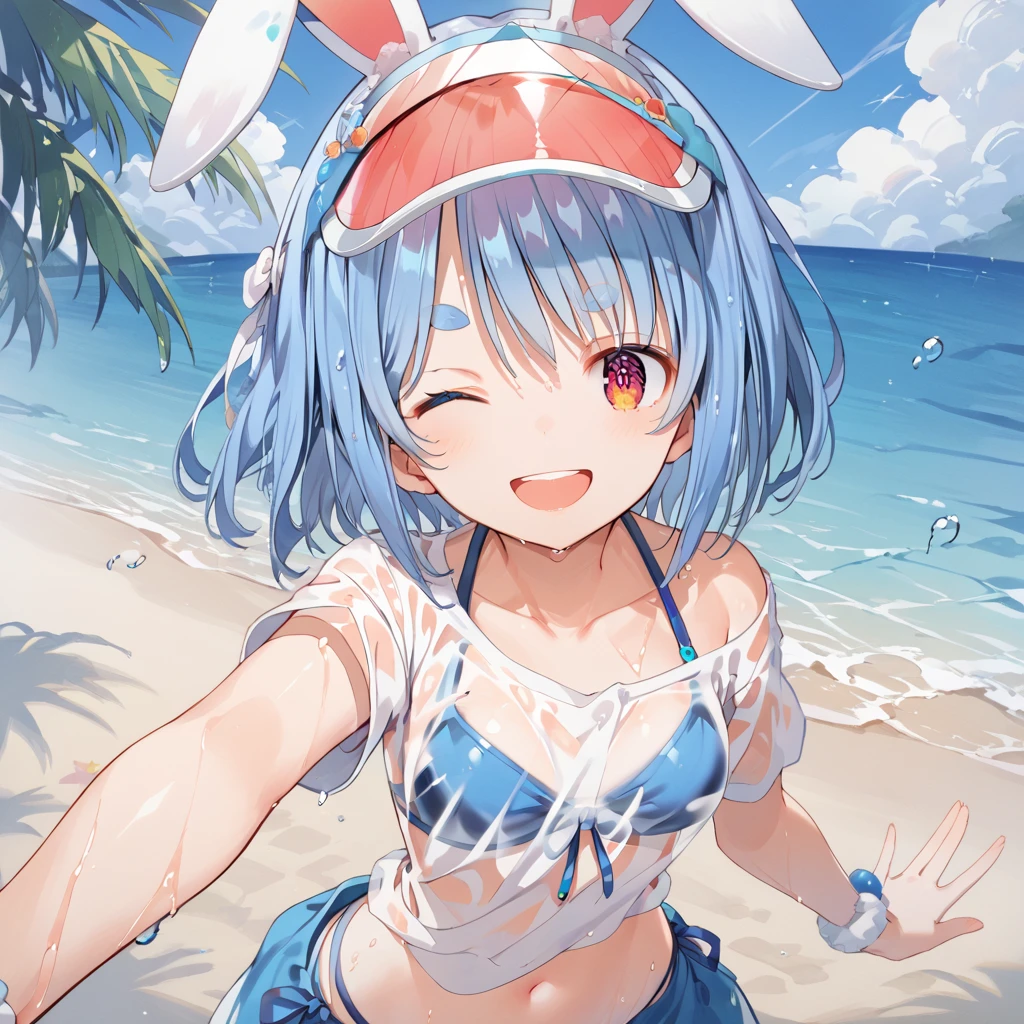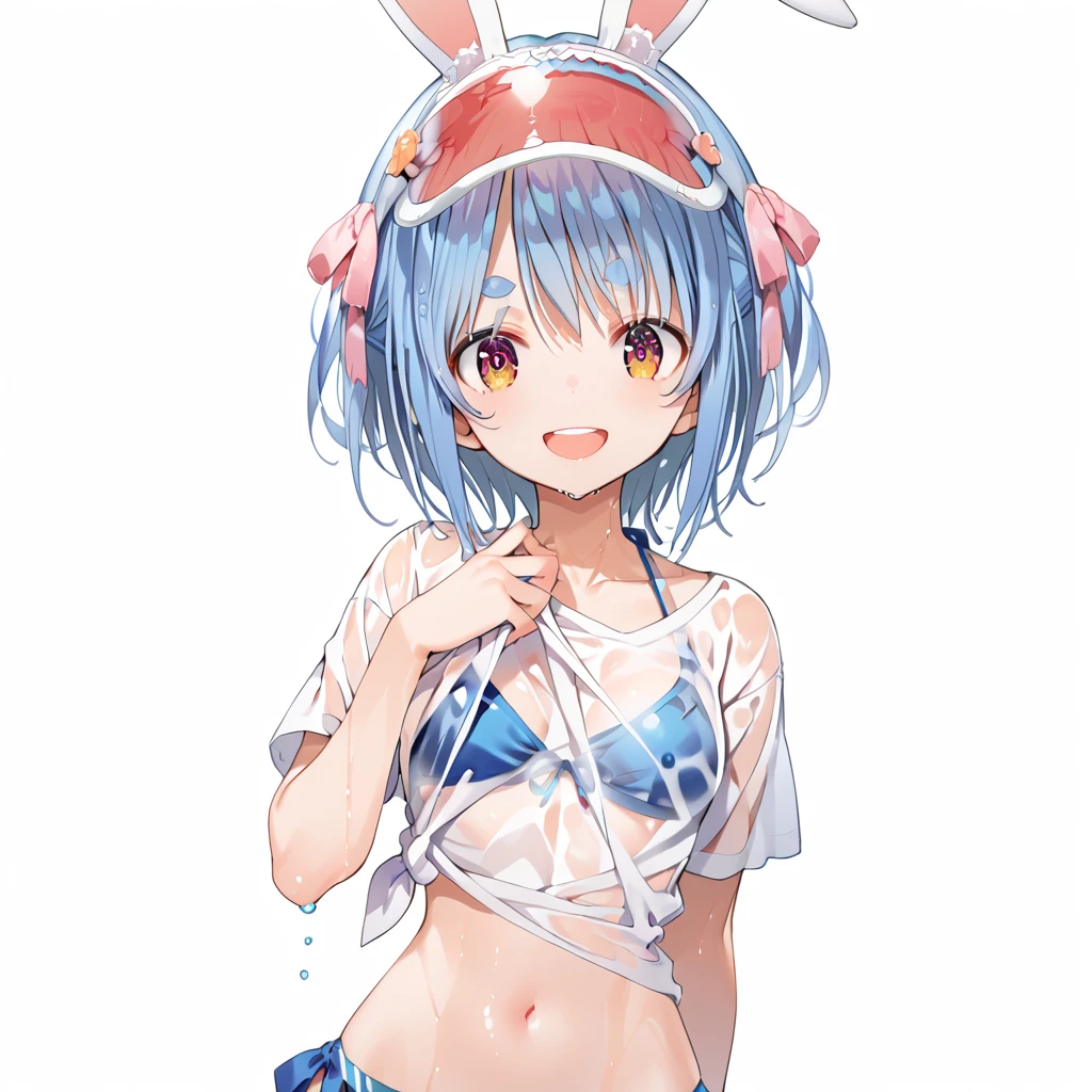 usada_pekora,1girl,blue hair,swimsuit,bikini,smile,visor cap,looking at viewer,thick eyebrows,shirt,open mouth,rabbit ears,animal ears,teeth,short hair,see-through wet shirt,navel,cowboy shot,