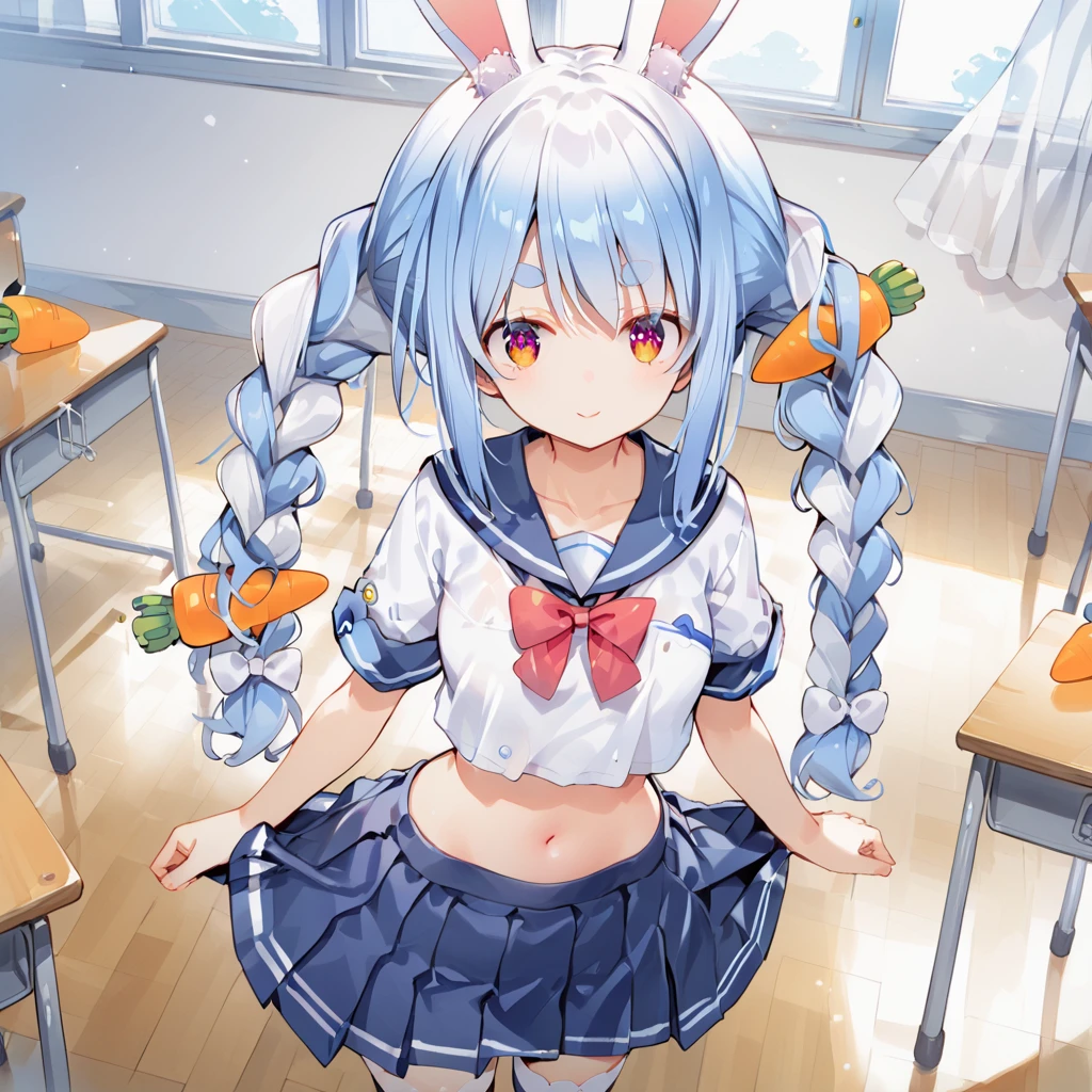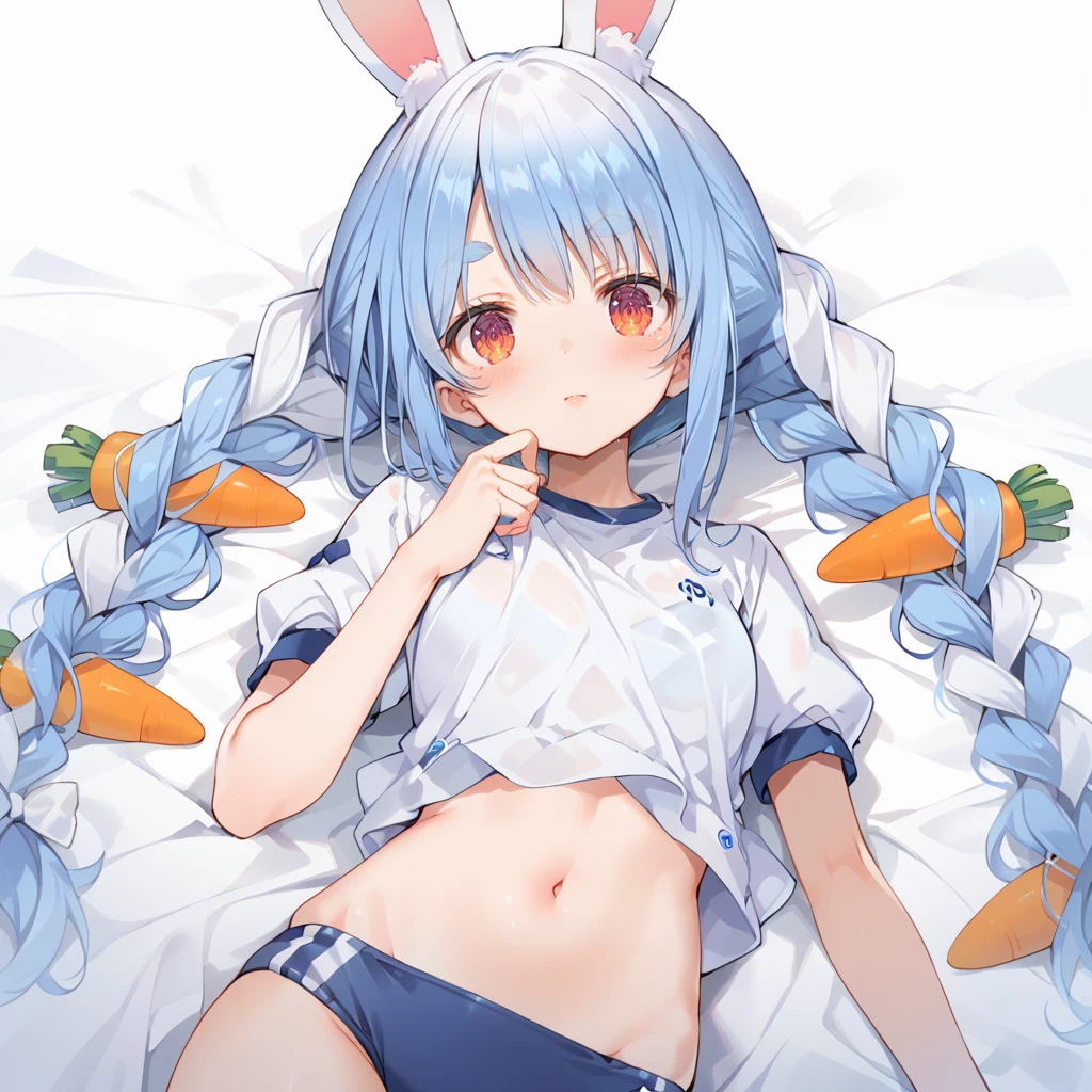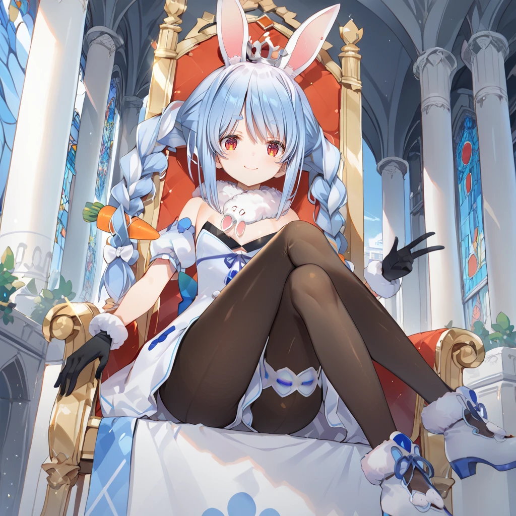 pekochan_nml,1girl, solo, animal ears, virtual youtuber, long hair, rabbit ears, gloves, pantyhose, carrot hair ornament, blue hair, hair ornament, food-themed hair ornament, twin braids, animal ear fluff, black gloves, braid, full body, white hair, white background, twintails,