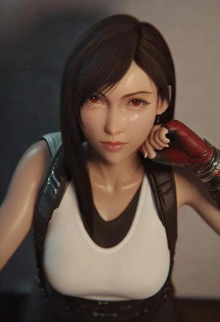 Realistic, tifa lockhart, 1girl, red eyes, swept bangs, long hair, black hair, large breasts, white shirt, sleeveless, black skirt, red fingerless gloves,