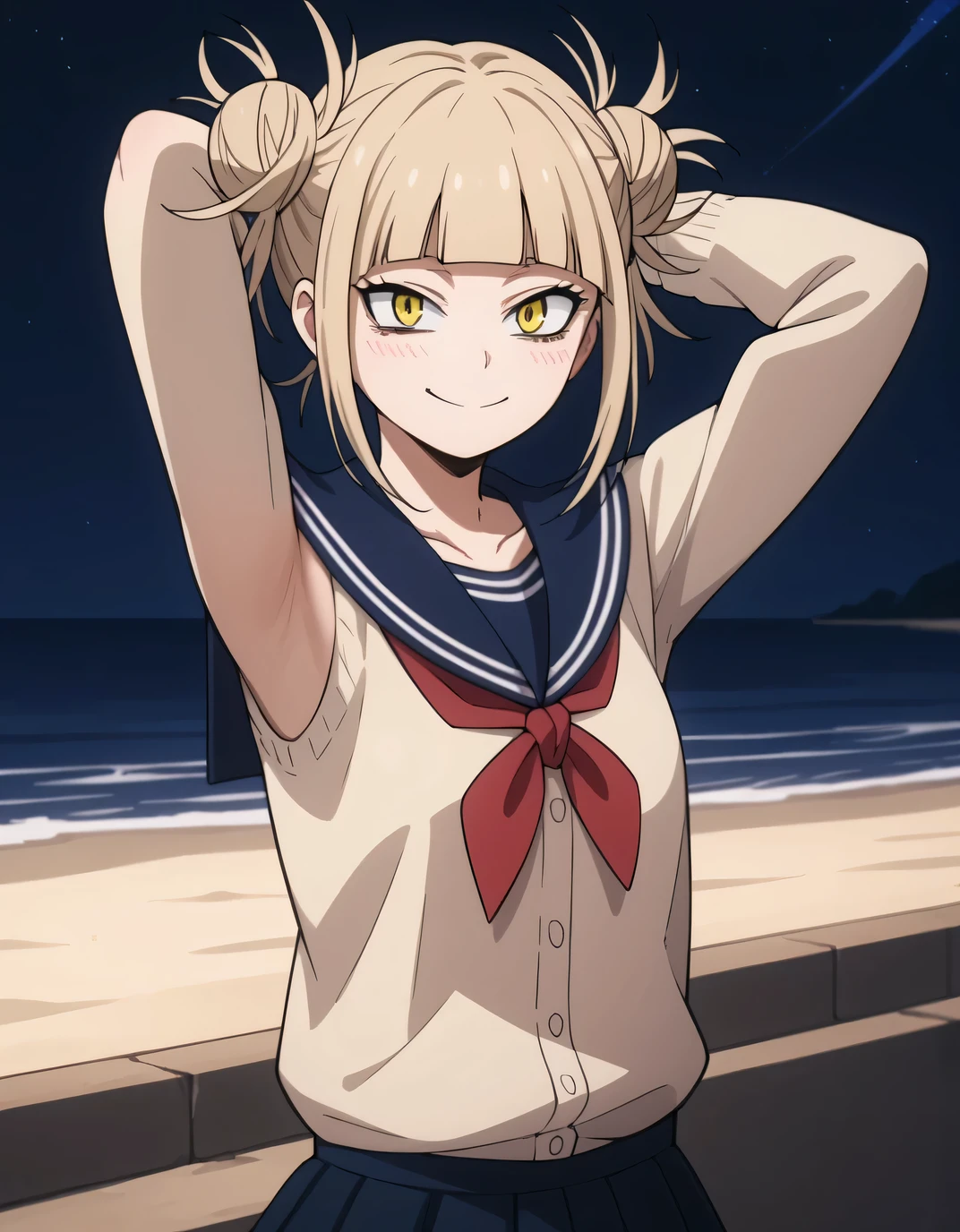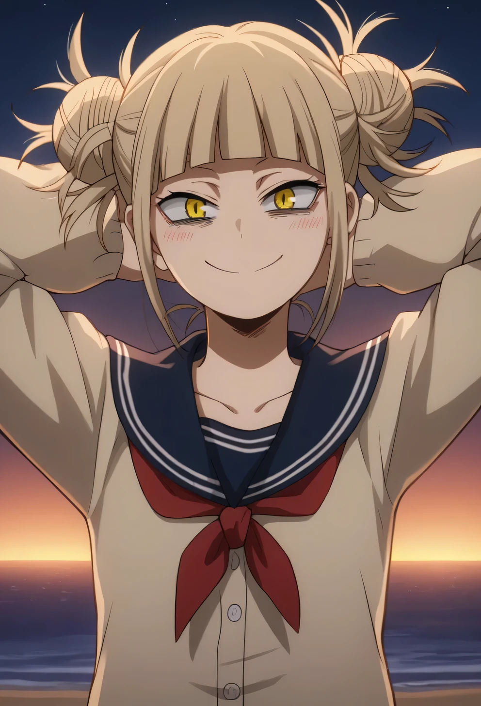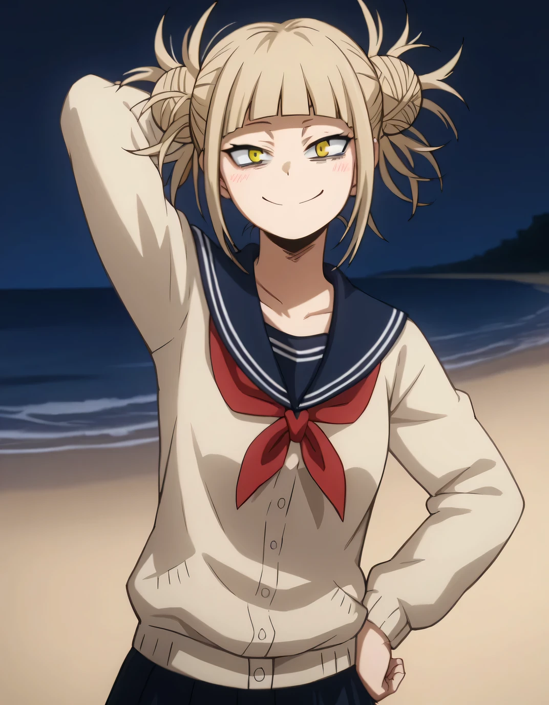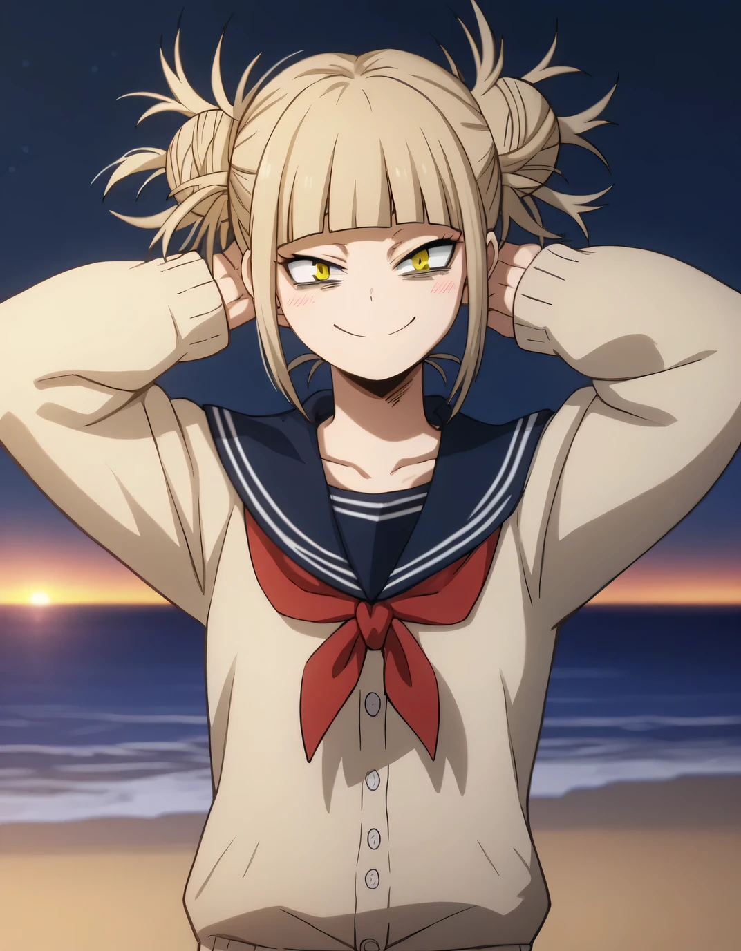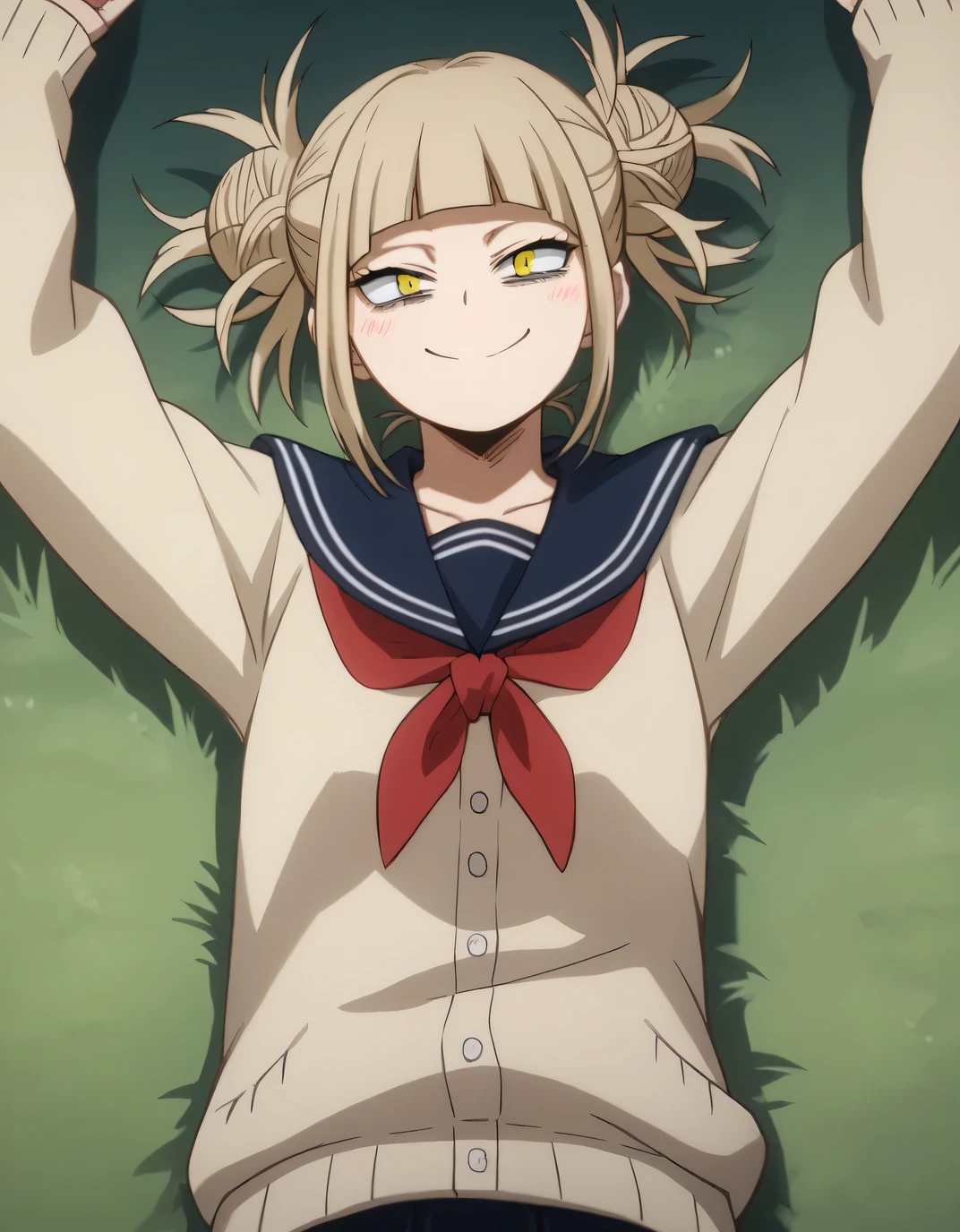 himiko toga, 1girl, solo, double bun, blonde hair, hair bun, yellow eyes, messy hair, school uniform, bags under eyes,bangs, skirt, blunt bangs, smile, cardigan, blush, socks