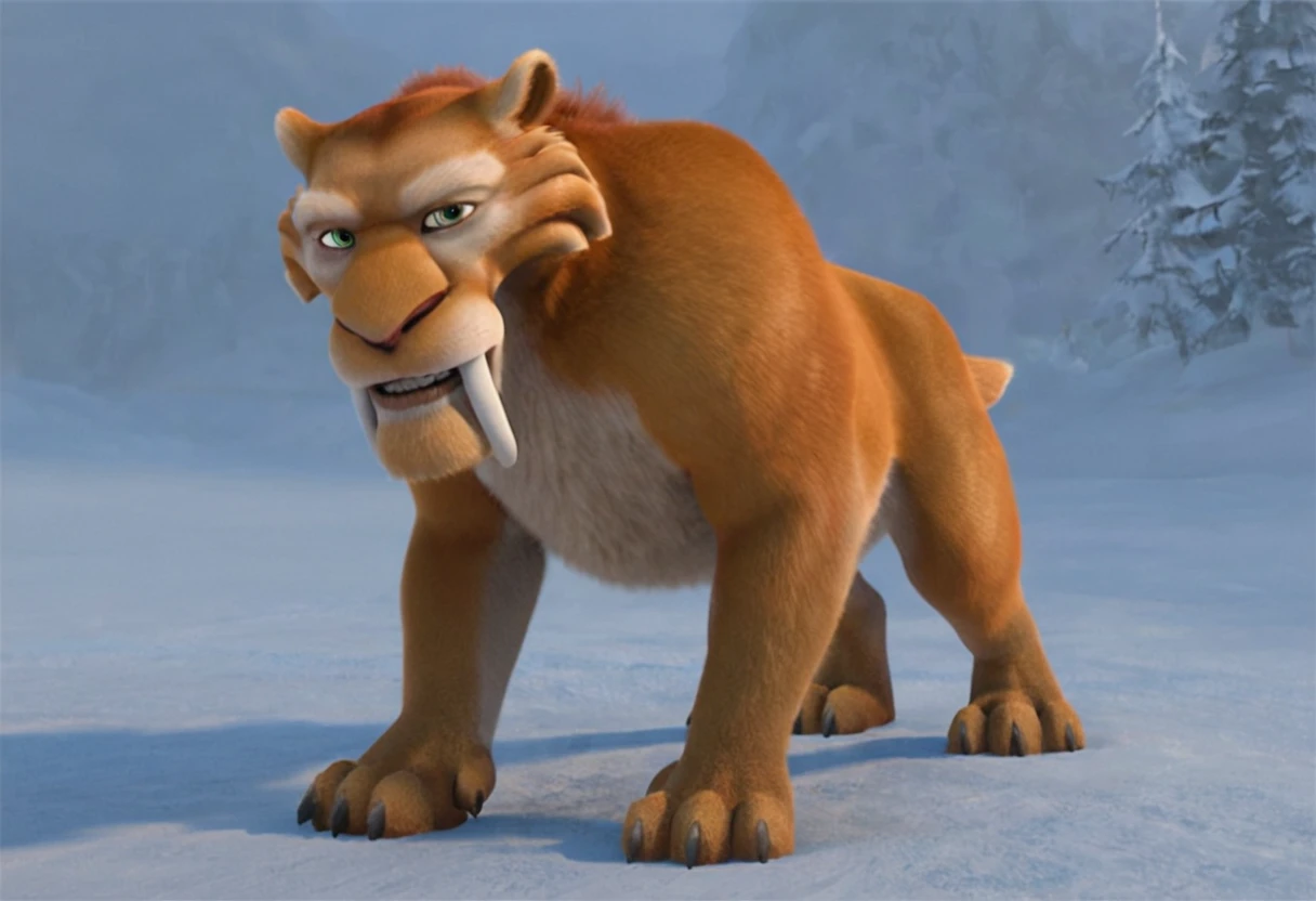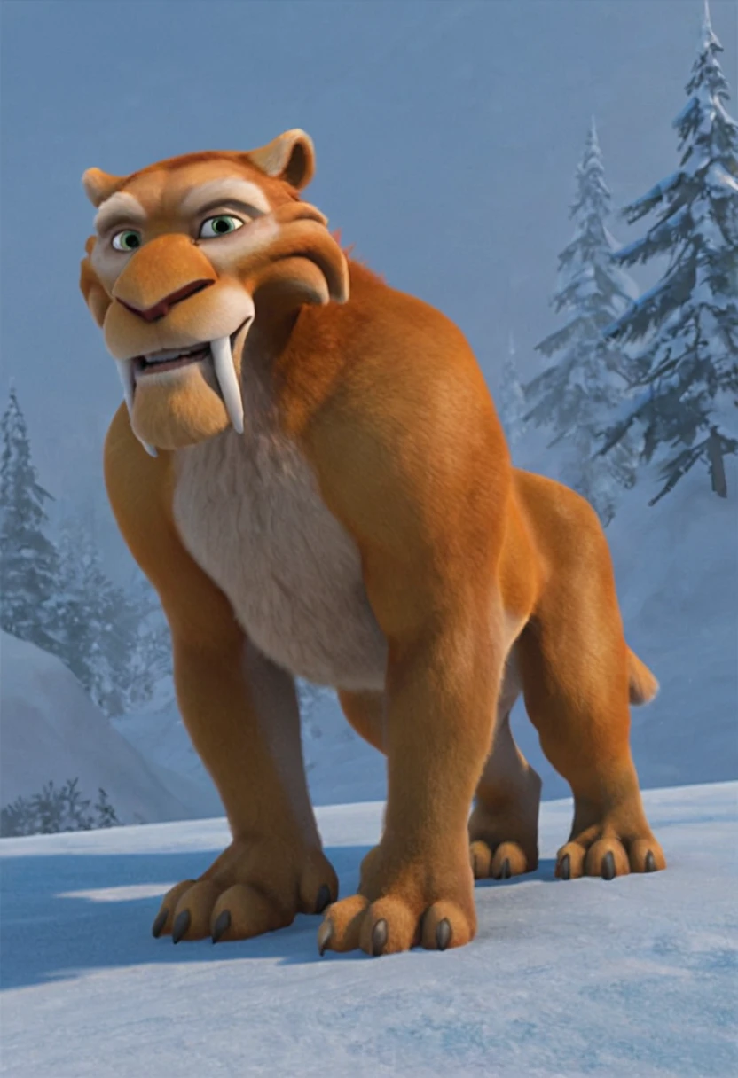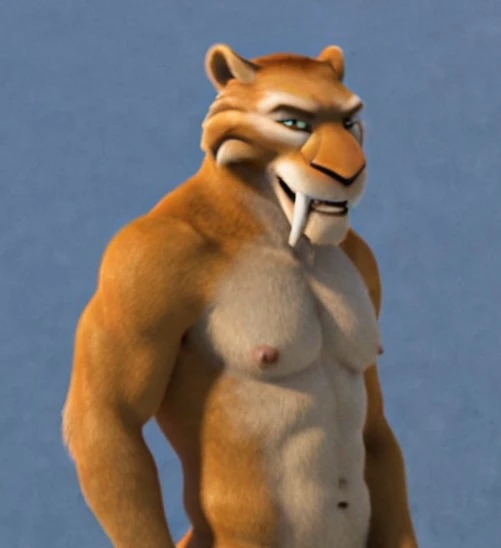 (diego:1.2, saber-tooth tiger), fangs, male, hazel green eyes, furry body, orange fur, stub tail,