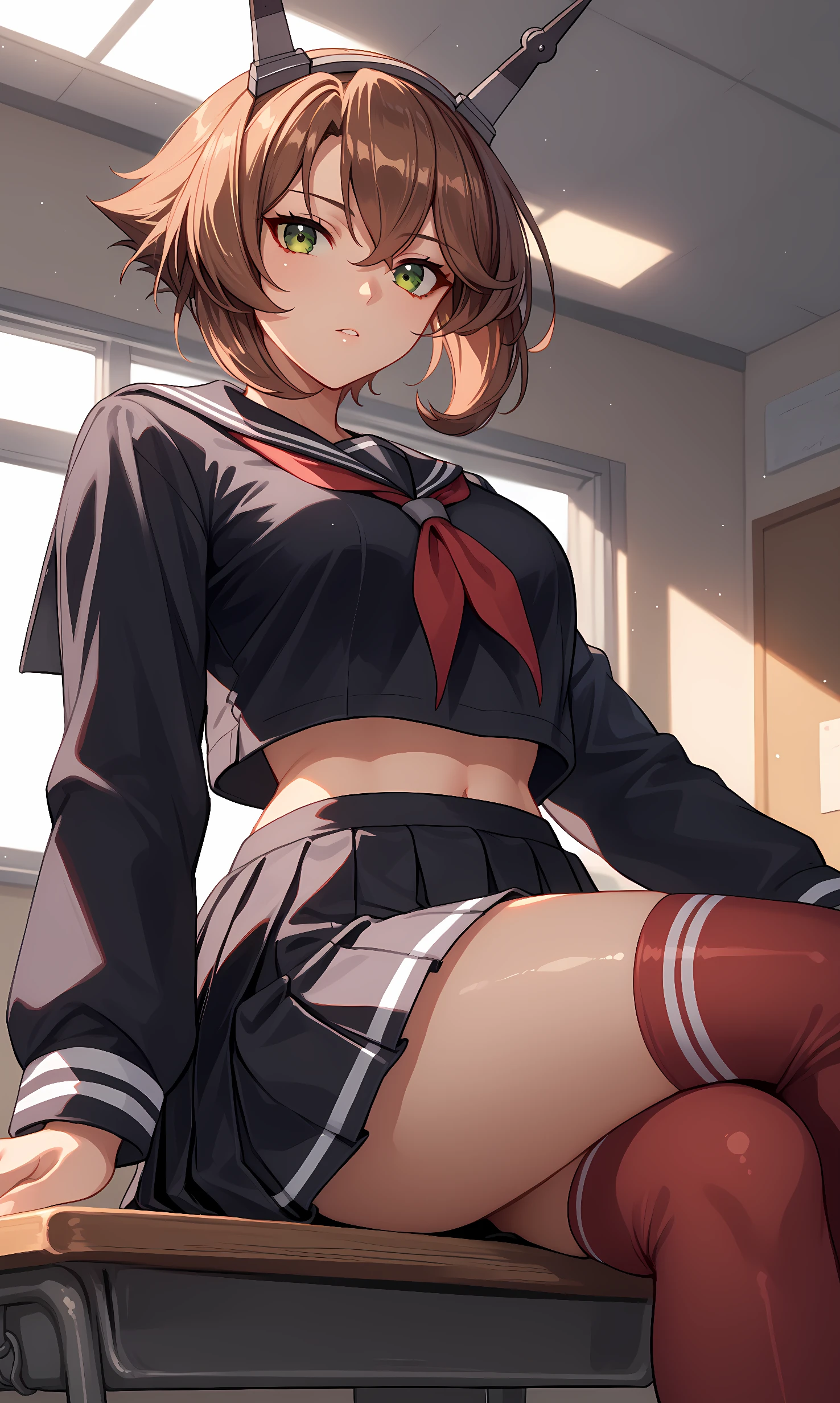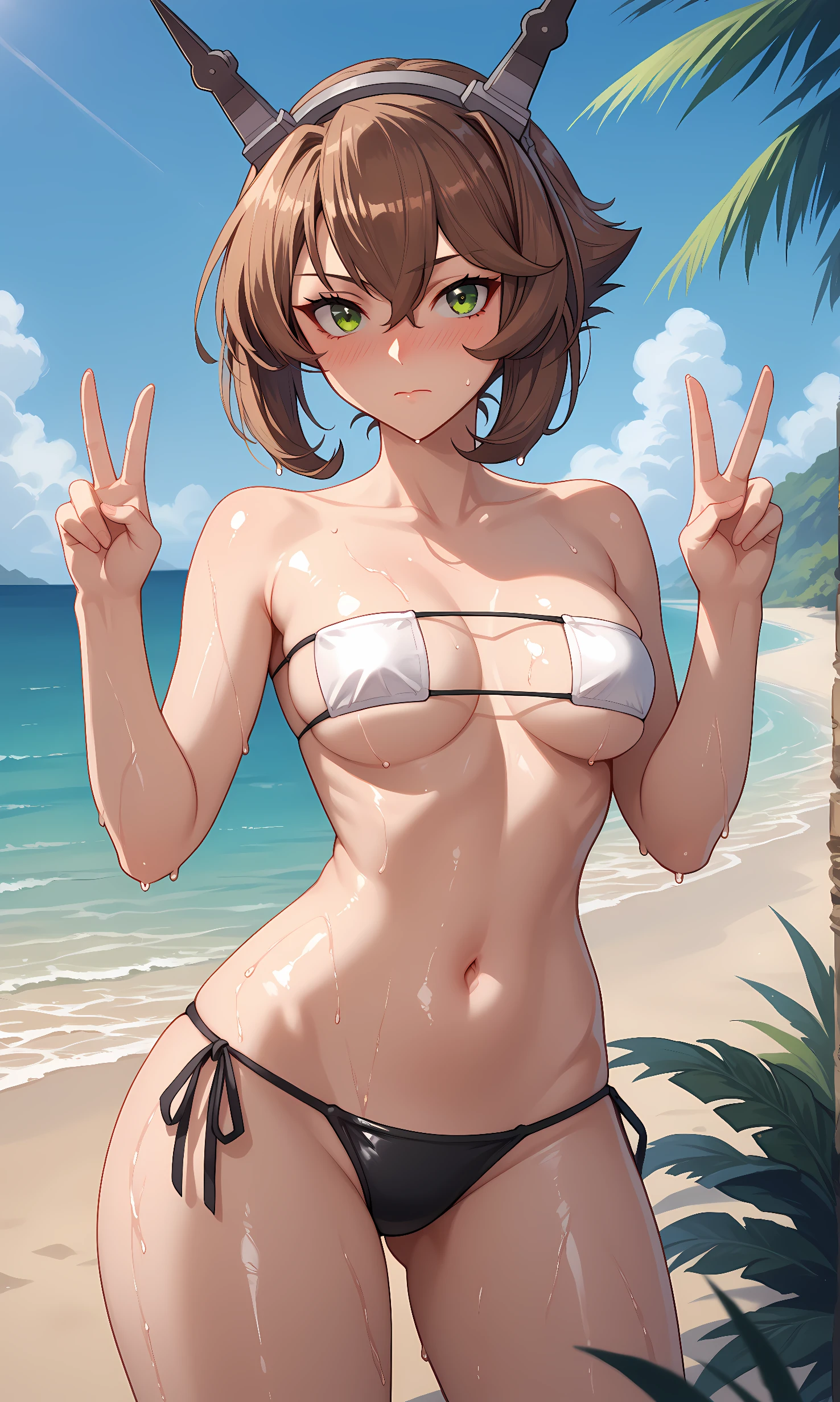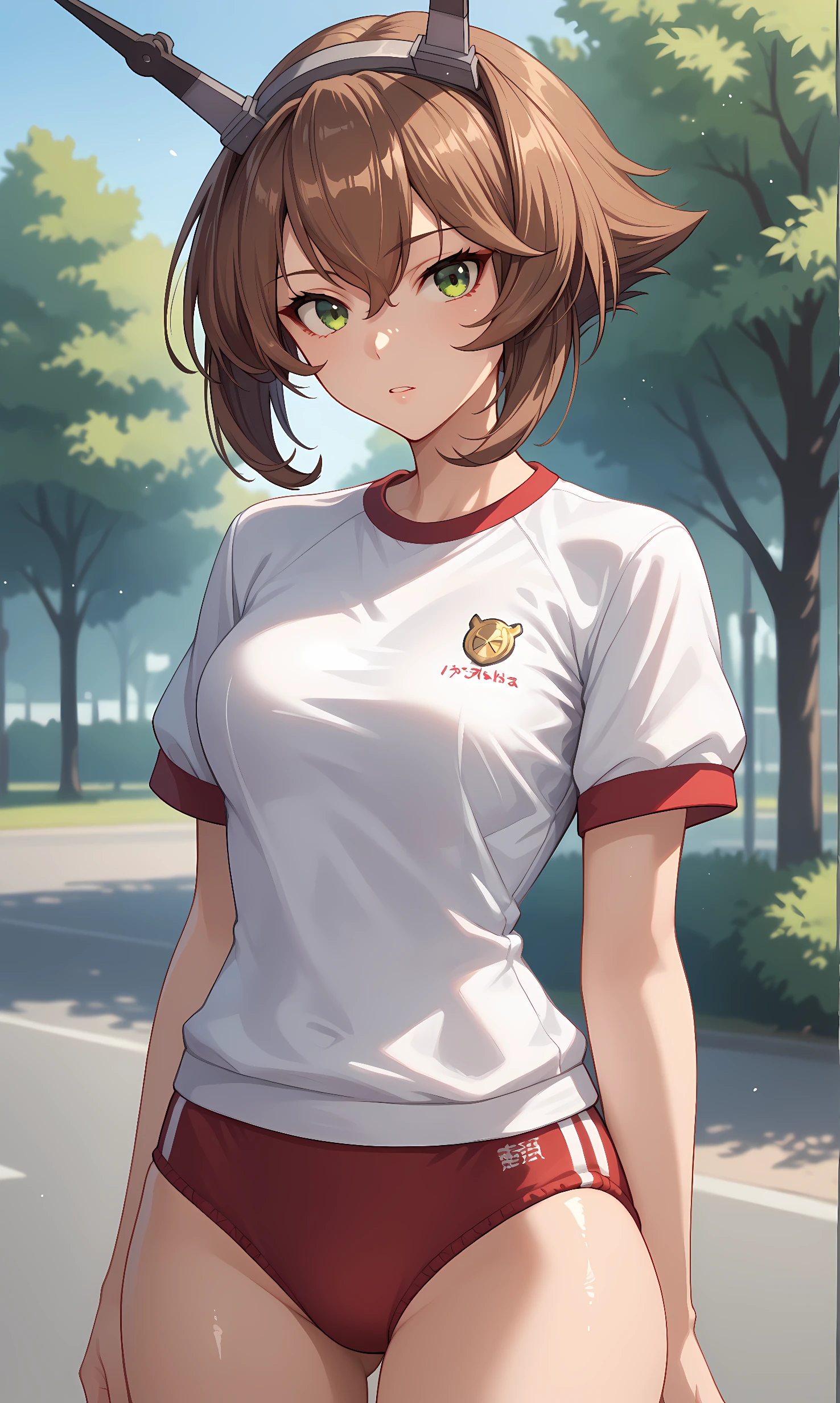 mutsu, green eyes, brown hair, short hair, hair ornament, headgear