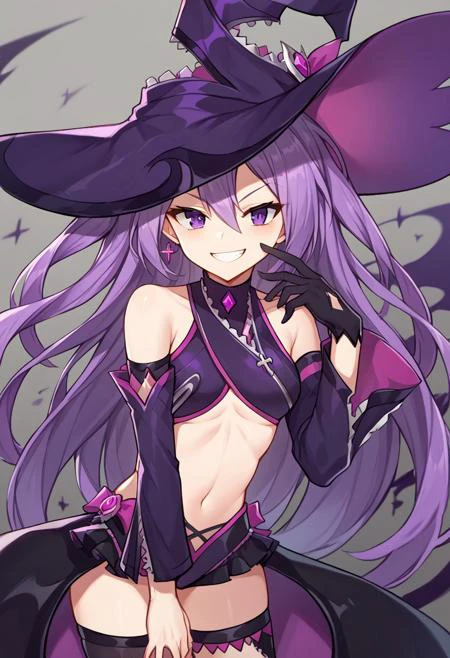 revealing clothes, asymmetrical legwear, purple footwear, purple gloves, purple hat, black thighhighs, detached sleeves, elbow gloves, frills, gloves, hat, mismatched legwear, shorts, short shorts, single elbow glove,
