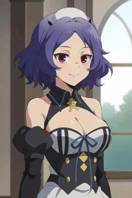 Triggers : 1girl,solo,chess belle,short hair,wink,bare shoulders,hair ornament,breasts,cleavage,smile,fang,upper body,maid headdress