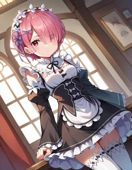 apron, black bow, black dress, black ribbon, bow, detached sleeves, dress, frilled apron, frilled sleeves, frills, juliet sleeves, long sleeves, maid, neck ribbon, puffy sleeves, ribbon, roswaal mansion maid uniform, thighhighs, two-tone dress, waist apron, white bow, white dress, white thighhighs,