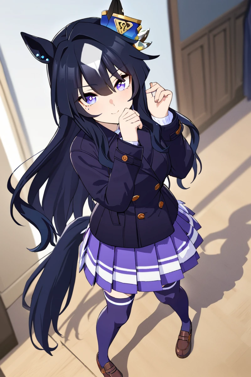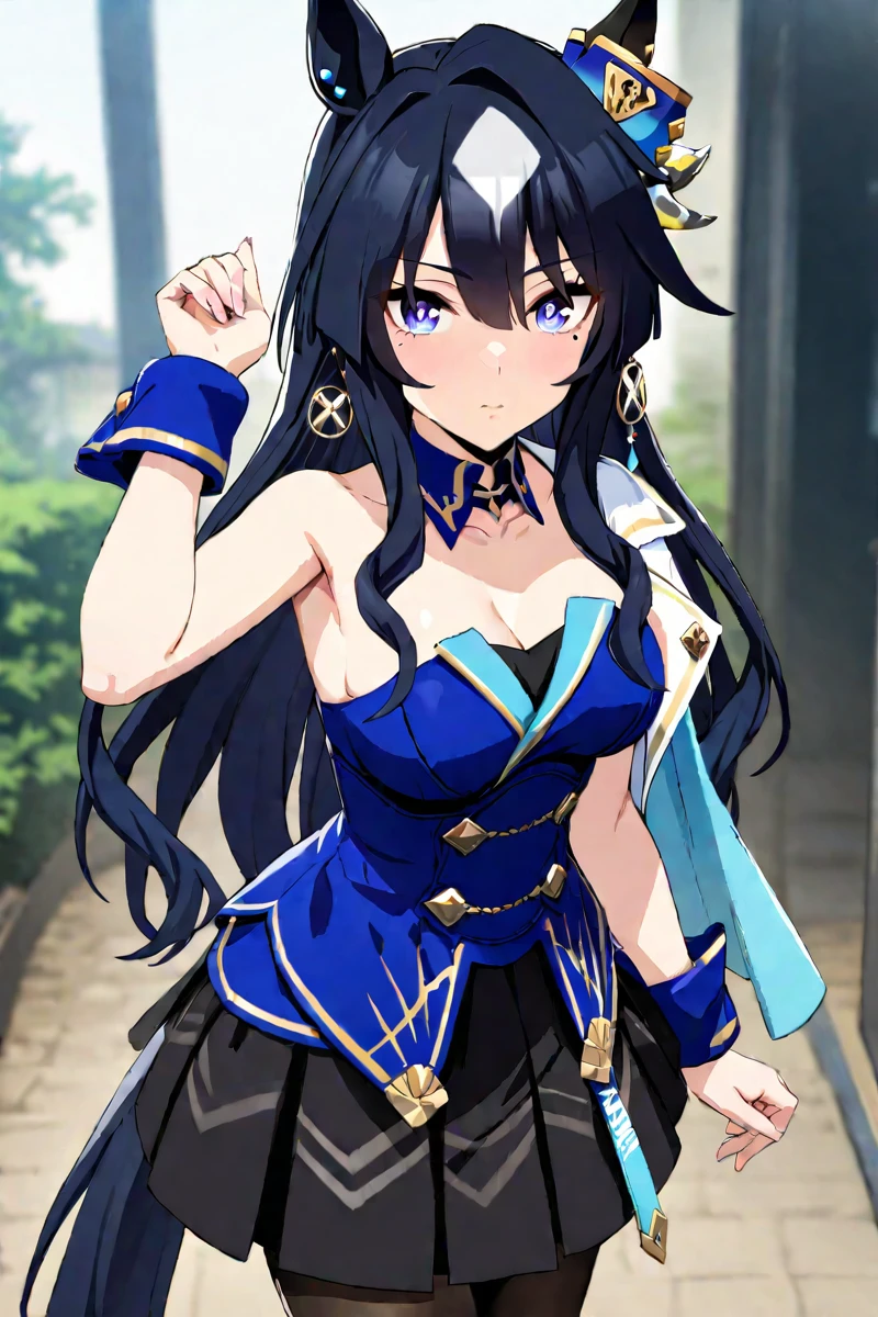 horse ears, black pantyhose, horse tail, peplum dress, black flared skirt, detached collar, hair ornament, mole under eye, earrings, one shoulder jacket, white high heel, blue high heel, asymmetrical high heels, wrist cuffs, blue sleeve, single sleeve, single bare shoulder, black corset, green pelisse