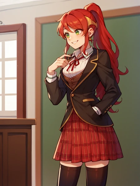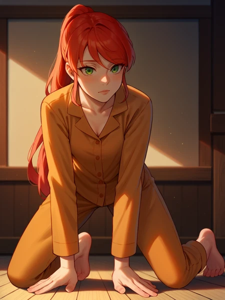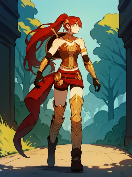 PyrrhaNik0s, 1girl, red hair, long hair, ponytail, green eyes, athletic female