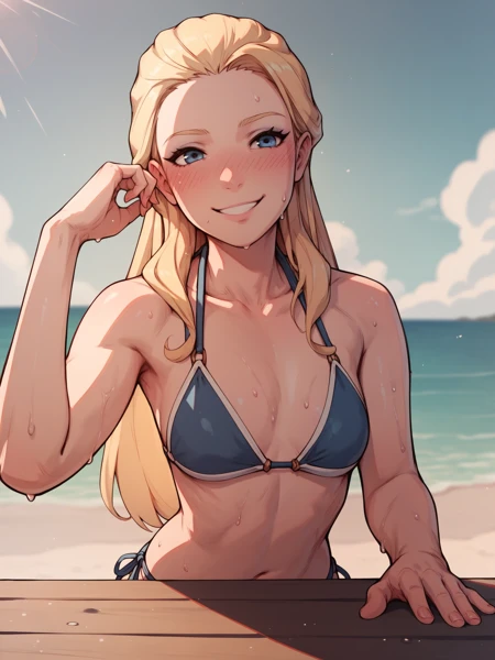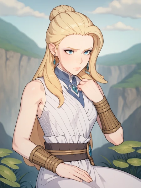 HumanSalem, 1girl, long hair, blonde hair, blue eyes, human, earrings, jewelry, white dress, sleeveless, bracer