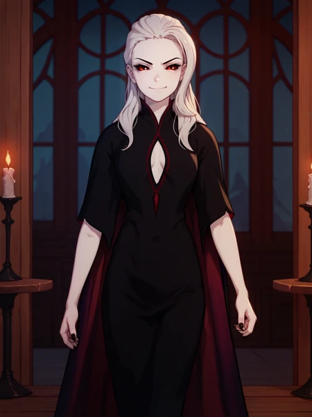 YoungSalem, 1girl, red eyes, black sclera, pale skin, white hair, black nails, black dress, clothing cutout, cape