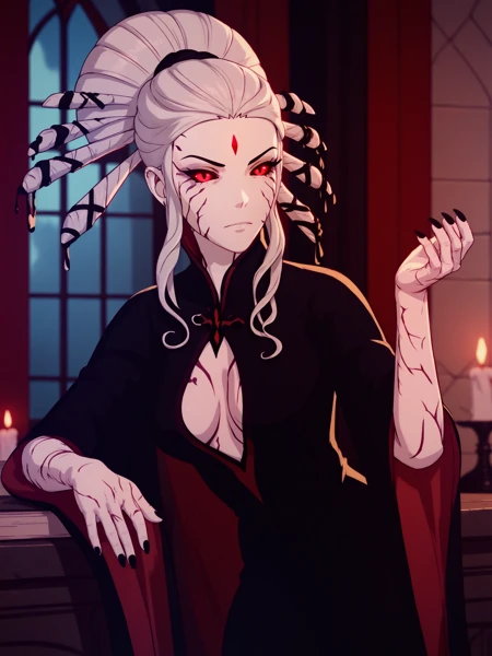 Vol7Salem, 1girl, red eyes, facial mark, black sclera, black nails, white hair, forehead mark, armored dress, bare shoulders, bone cuffs