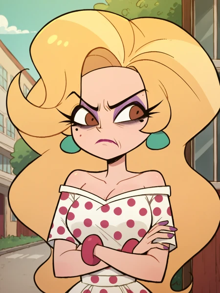 MarthaHuman1, 1girl, blonde hair, long hair, brown eyes, purple eyeshadow, jewelry, off-shoulder shirt, earrings, makeup, polka dots