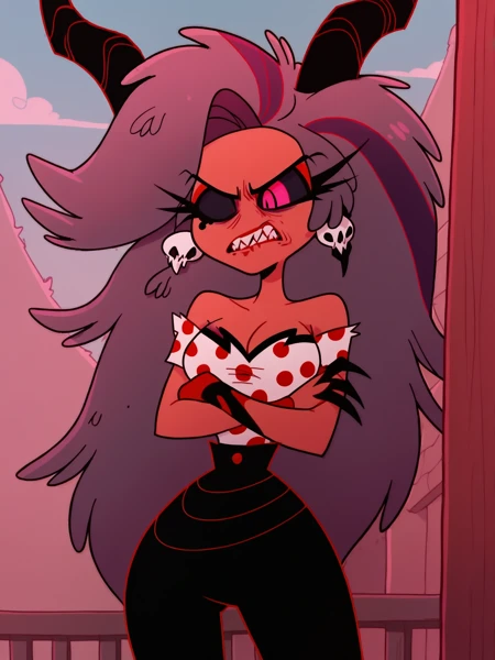 MarthaDemon, 1girl, sharp teeth, horns, demon girl, purple hair, long hair, pink eyes, black sclera, red eyeshadow, off-shoulder shirt, earrings, makeup, polka dots, black pants, one eye