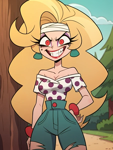 MarthaHuman2, 1girl, blonde hair, long hair, red eyes, purple eyeshadow, jewelry, off-shoulder shirt, earrings, makeup, polka dots, torn clothes