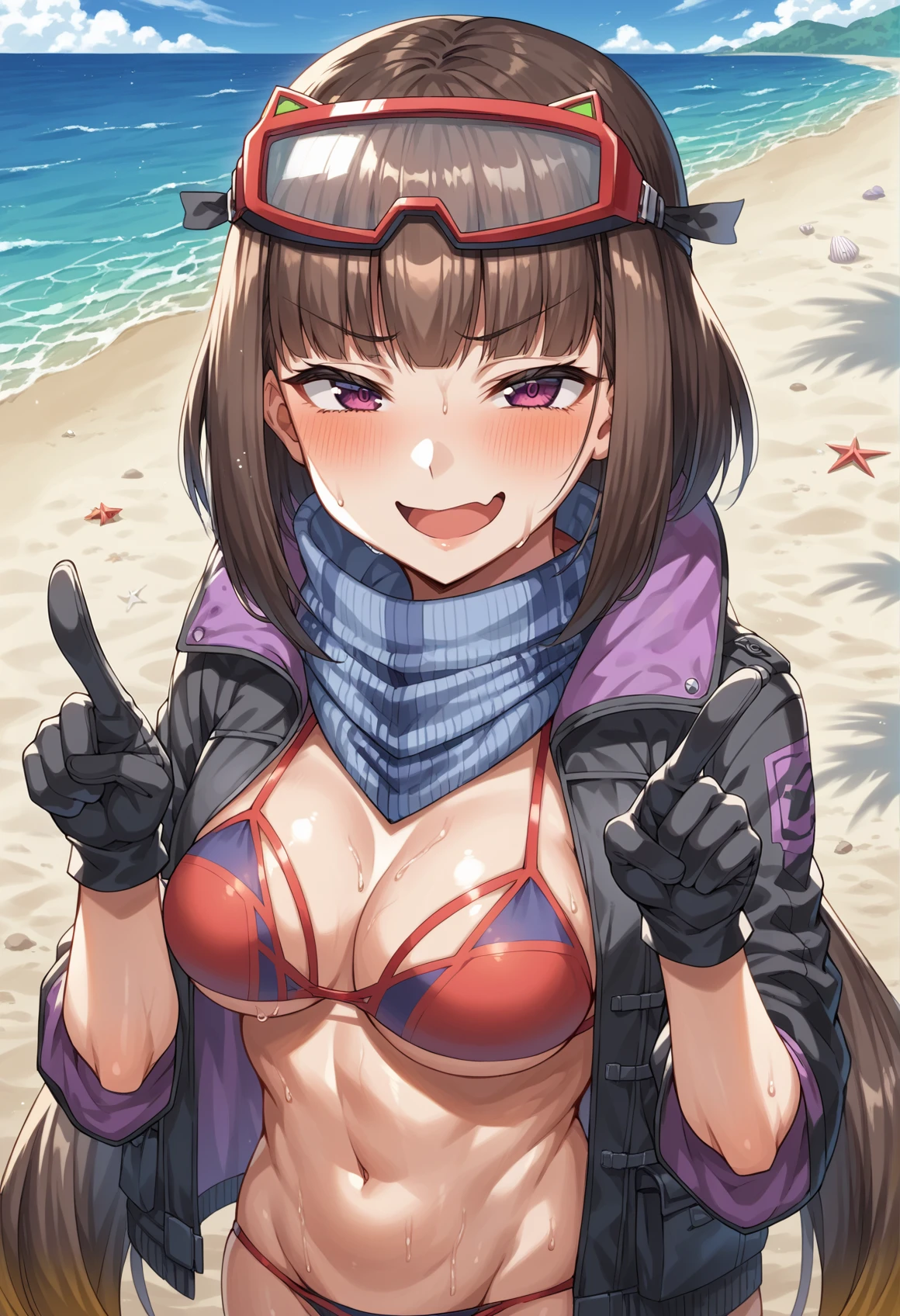 very long hair, multicolored hair, gradient hair, brown hair, blonde hair, purple eyes, low twintails, scarf, bikini, goggles on head, thigh holster, gloves, jacket,