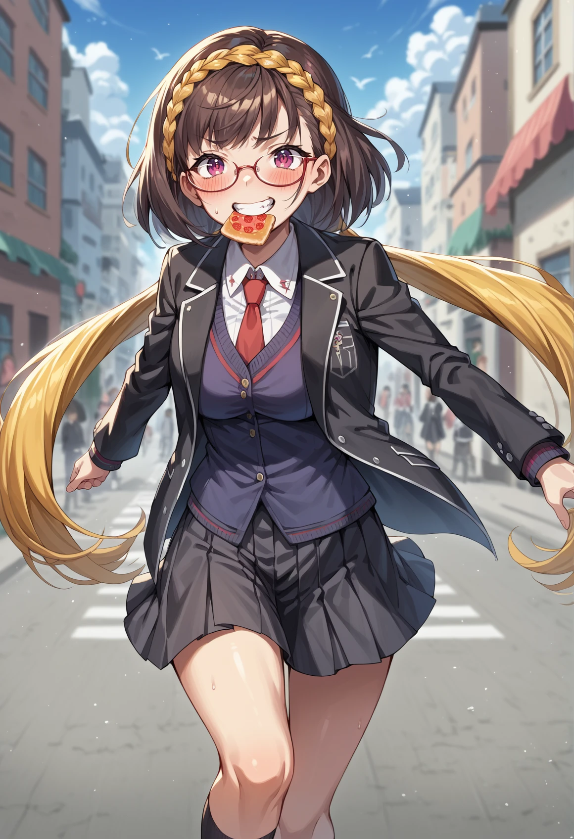 very long hair, multicolored hair, brown hair, blonde hair, purple eyes, low twintails, braid, school uniform, red necktie, White shirt, blue vest, black jacket, black skirt,