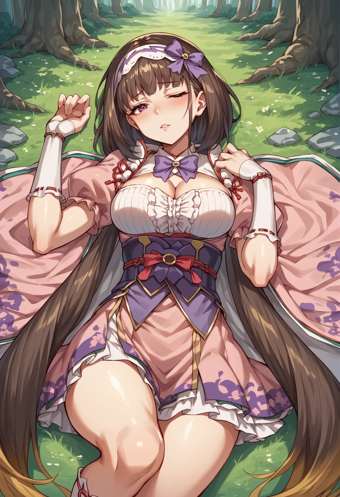 very long hair, multicolored hair, gradient hair, brown hair, blonde hair, purple eyes, low twintails, hairband, ribbon, blouse, japanese clothes, bridal gauntlets, skirt, detached collar, red bowtie, juliet sleeves, puffy sleeves, short sleeves, cleavage,