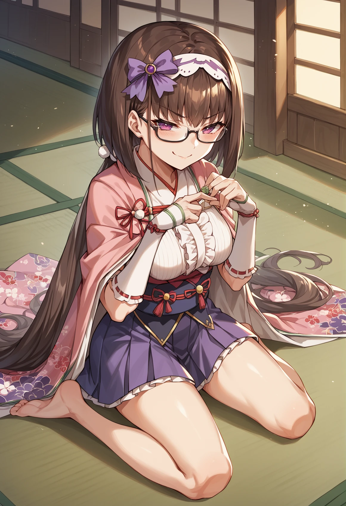 very long hair, multicolored hair, gradient hair, brown hair, blonde hair, purple eyes, low twintails, hairband, ribbon, cape, blouse, japanese clothes, bridal gauntlets, skirt,