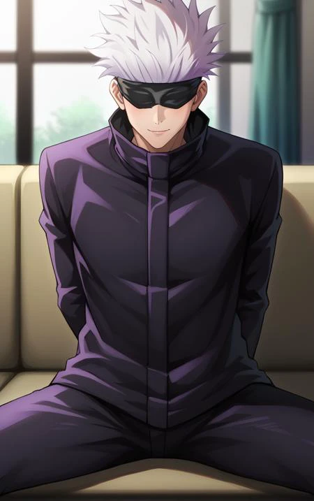 Masked_GojouSatoru_ownwaifu, 1boy, black blindfold, gojou satoru, gradient hair, male focus, white hair, short hair, covered eyes, spiked hair, blindfold, black jacket, high collar, long sleeves, black pants, black shirt,