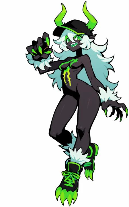 Reinforcement Tags: white hair, long hair, sharp teeth, navel, hair between eyes, green eyes, horns, nail polish, monster girl,fingernails, sharp fingernails, green nails, black skin,green eyeshadow, monster energy