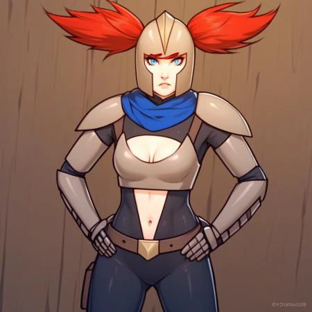Jean, red hair, twintails,
