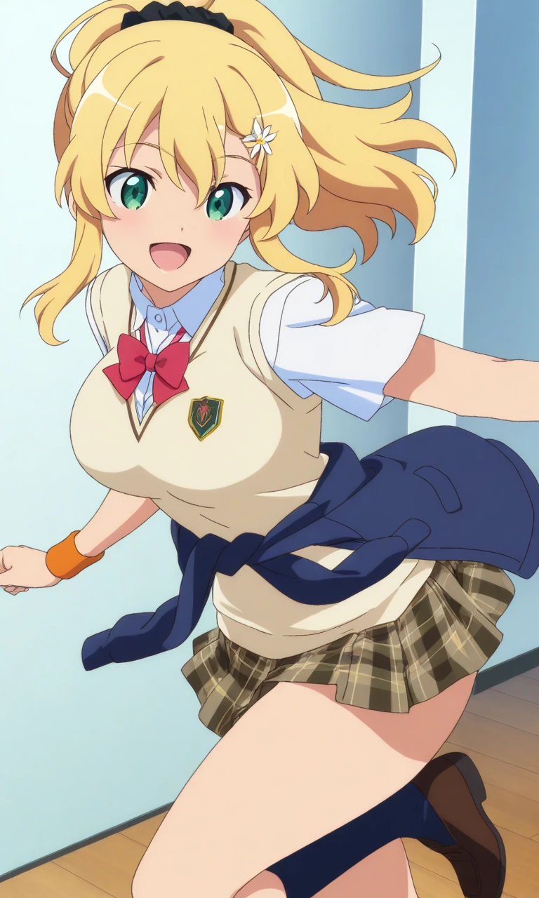 shiraishi nana,green eyes,blonde hair,long hair,hair ornament,ponytail, Black Scrunchie,large breasts,wide hips,
