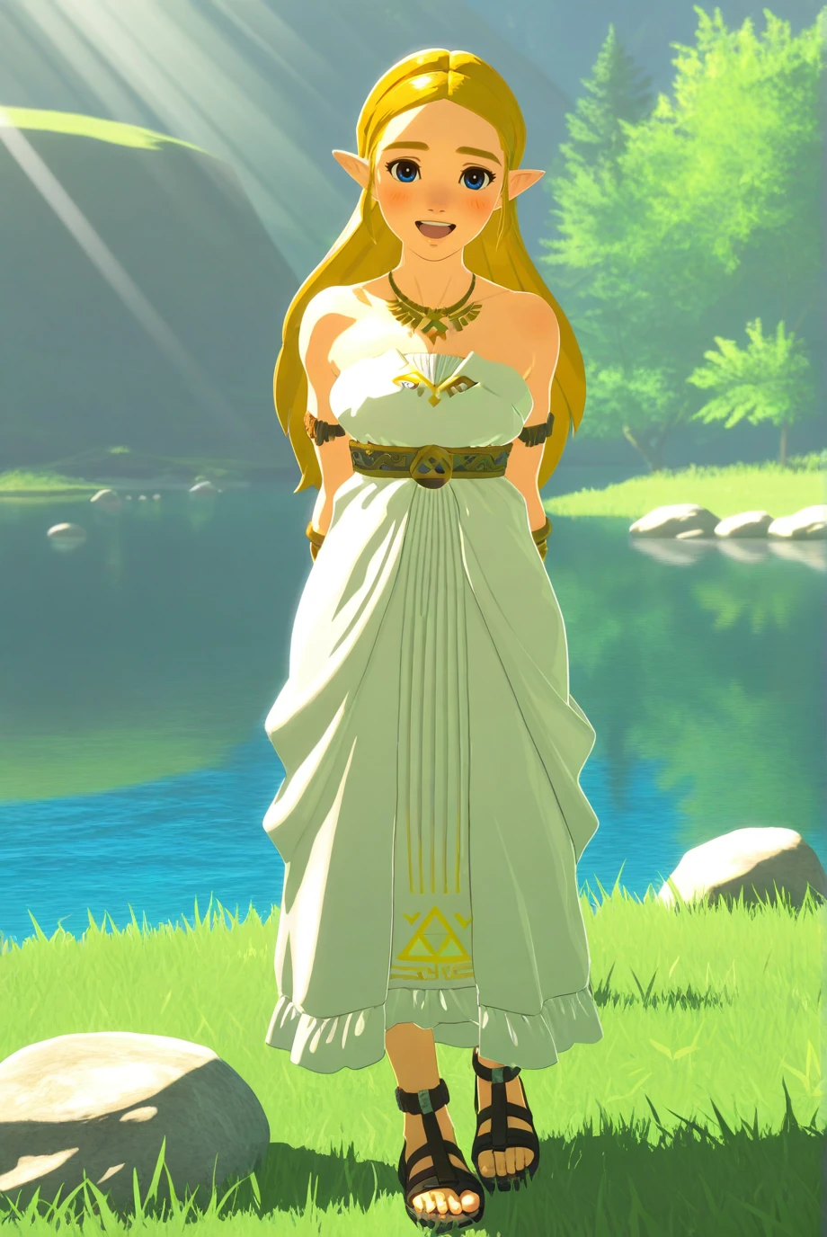 long hair, outfit_2, white dress, strapless dress, bare shoulders, necklace, gold chest belt, triforce, gold bracer, black sandals,
