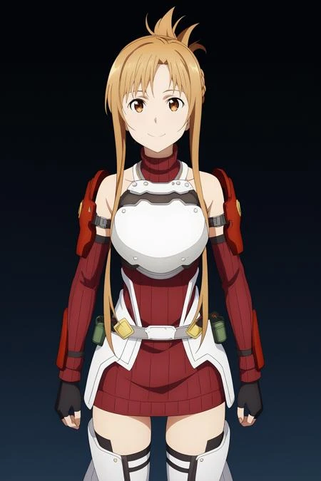 ggout, folded ponytail, ribbed sweater, red sweater dress, armor, fingerless gloves, thigh boots, white thighhighs,