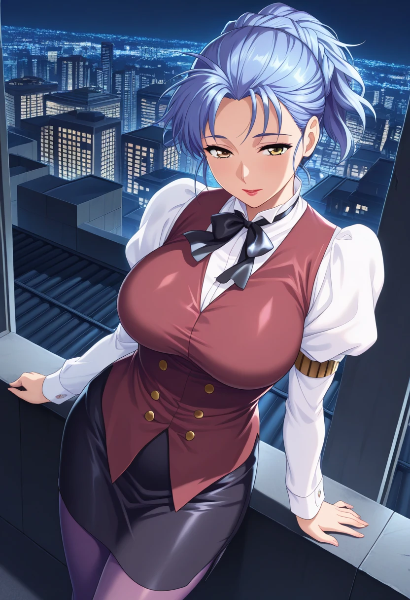 white shirt,long sleeves,juliet sleeves, red vest,buttons, black bowtie,black skirt,pencil skirt, purple pantyhose,armband,
