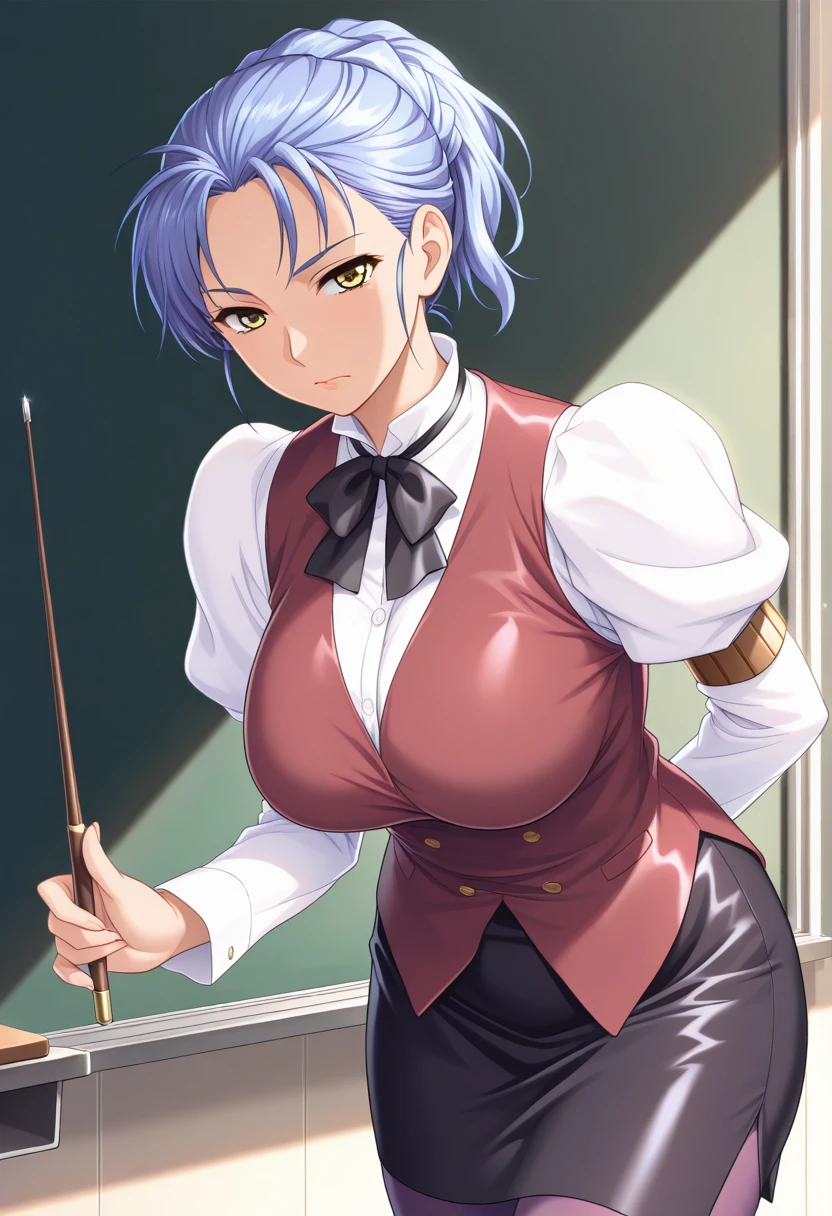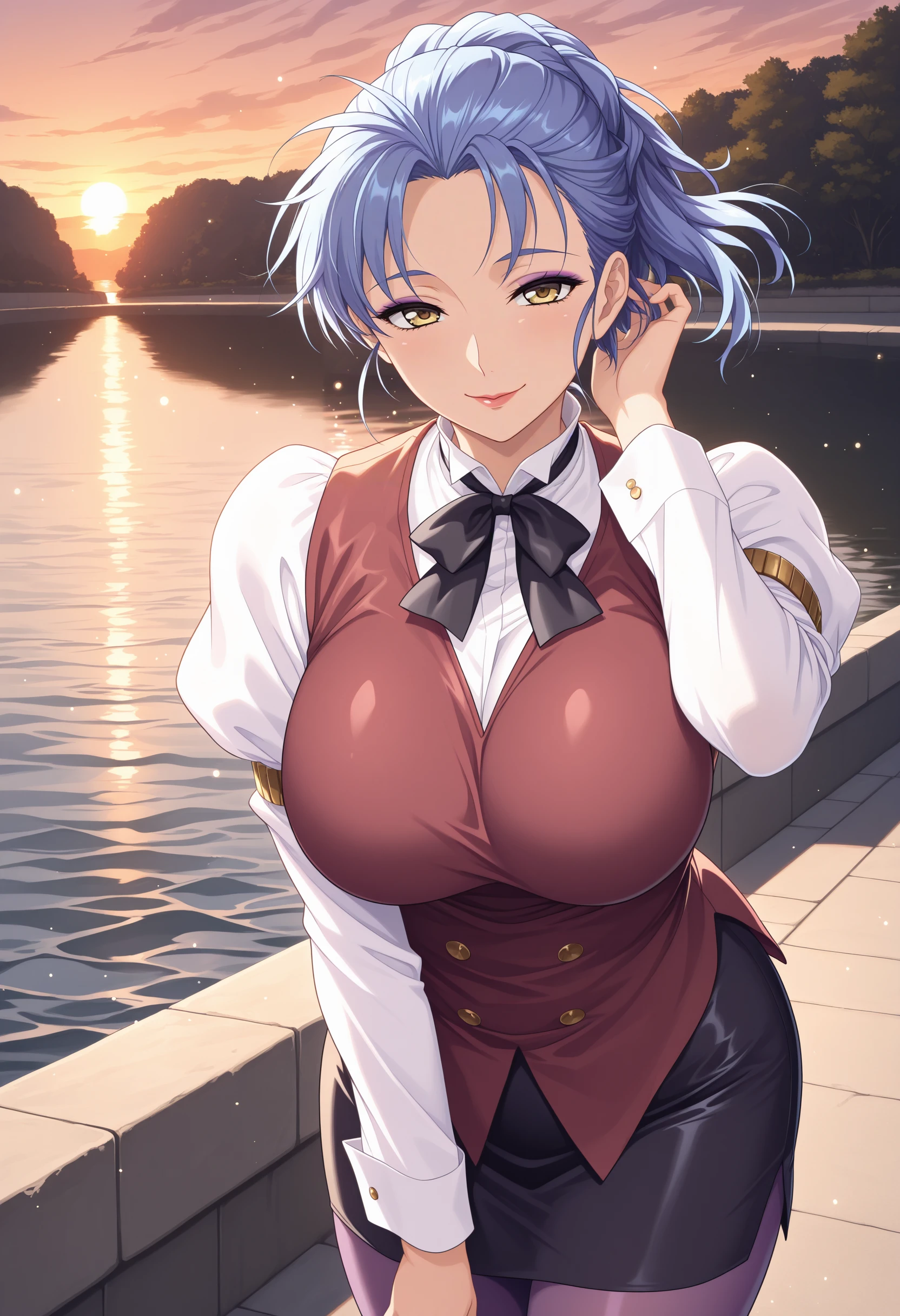 ayaya, 1girl, blue hair,yellow eyes,ponytail, hair up, short hair,large breasts,mature female,