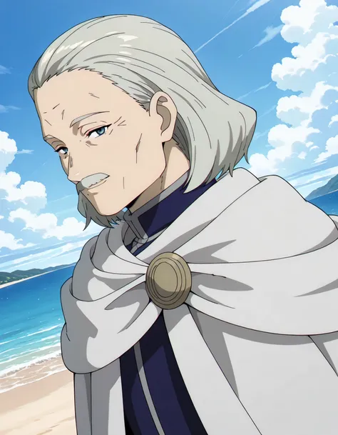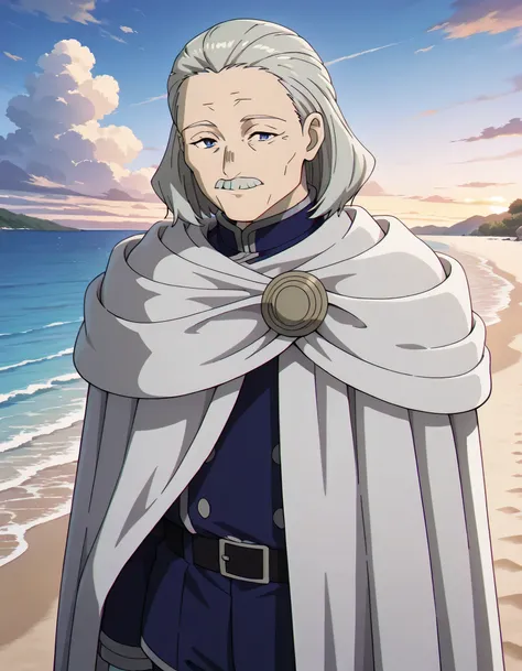 lernen, blue eyes, grey hair, short hair, mustache, white cape, shirt, long sleeves, belt, pants