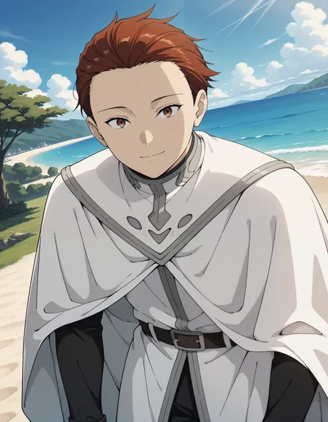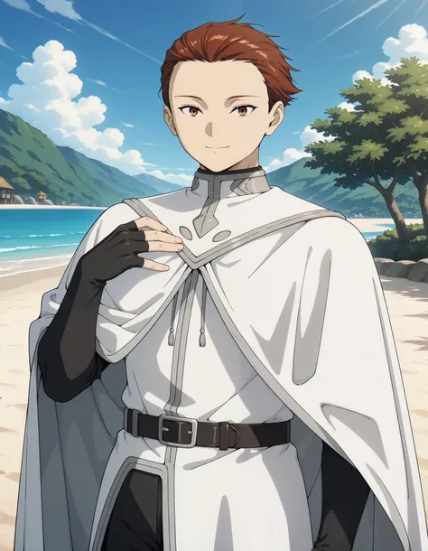 stoltz, brown eyes, brown hair, short hair, white cape, fingerless gloves, shirt, black sleeves, belt, black pants
