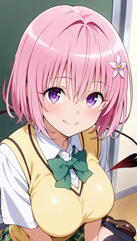 Momo Belia Deviluke, pink hair,hair ornament,hair flower,hair between eyes,bangs,purple eyes