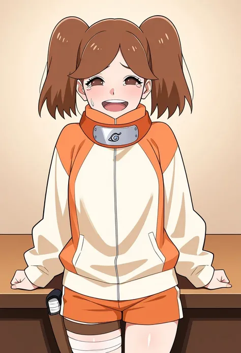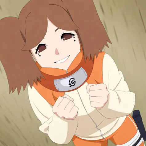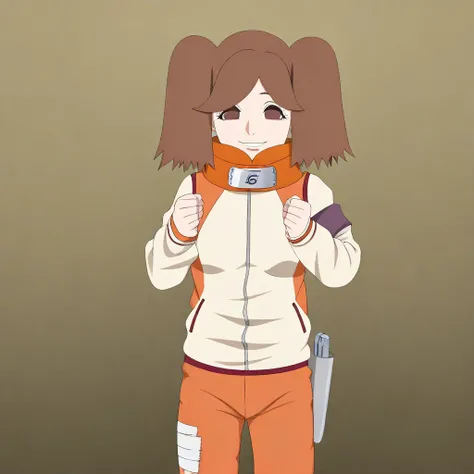 ((konohagakure orange forehead protector headband with dark grey konoha symbol around her neck, high-necked orange sweater that covers her neck and long sleeves that go right up to her fingertips, her sweater is beige with an orange area around the shoulders and sleeves and collar, short orange pants, holster, bandage on thigh, )) brown ninja boots,