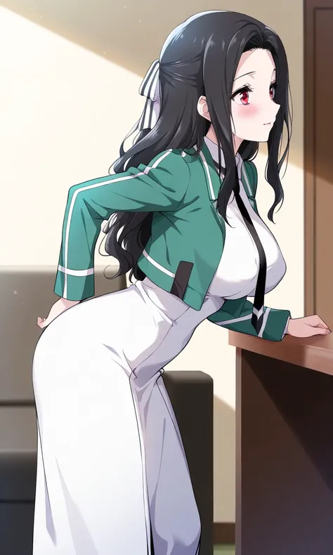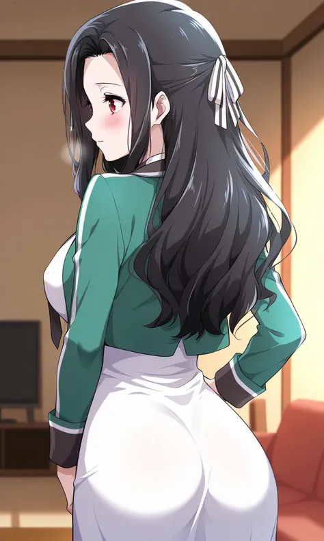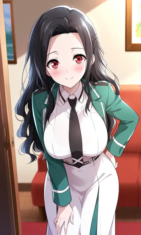 masterpiece, cute, lovely, (best quality:1.3), (amazing quality:1.3) ,very aesthetic, 1girl, solo, blush, face satisfied, living room, standing, (view from above:1.2) ,Mayumi_Saegusa, long hair, black hair, hair intakes, forehead, red eyes, cropped jacket, green jacket, collared dress, long dress, white dress, black necktie, long sleeves,