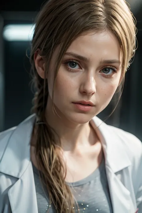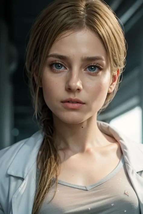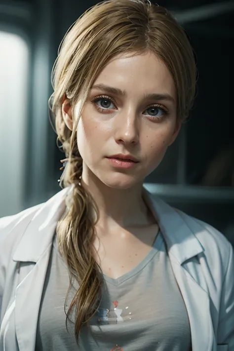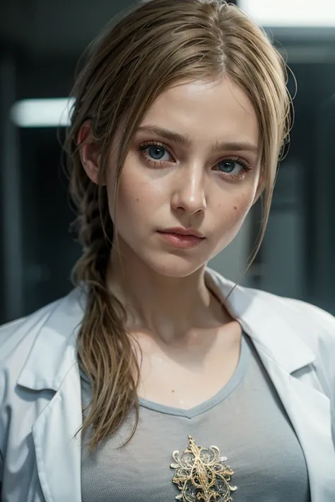 Prompt: A stunning and intricate full-color portrait in Ultra-HD, 36-year-old girl, detailed face, long blonde hair, clear eyes, wearing a white coat, gray t-shirt, epic character composition, sharp focus, natural lighting, subsurface dispersion, f2, 35mm