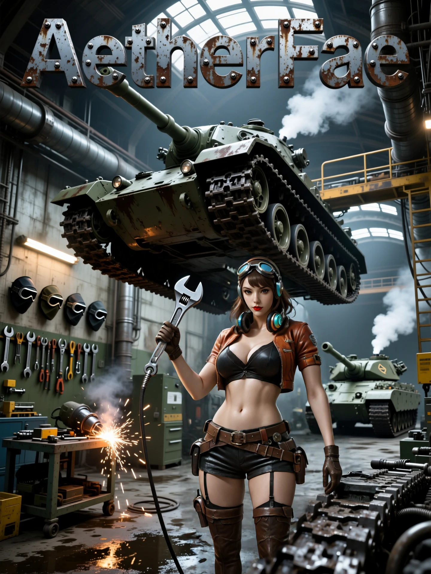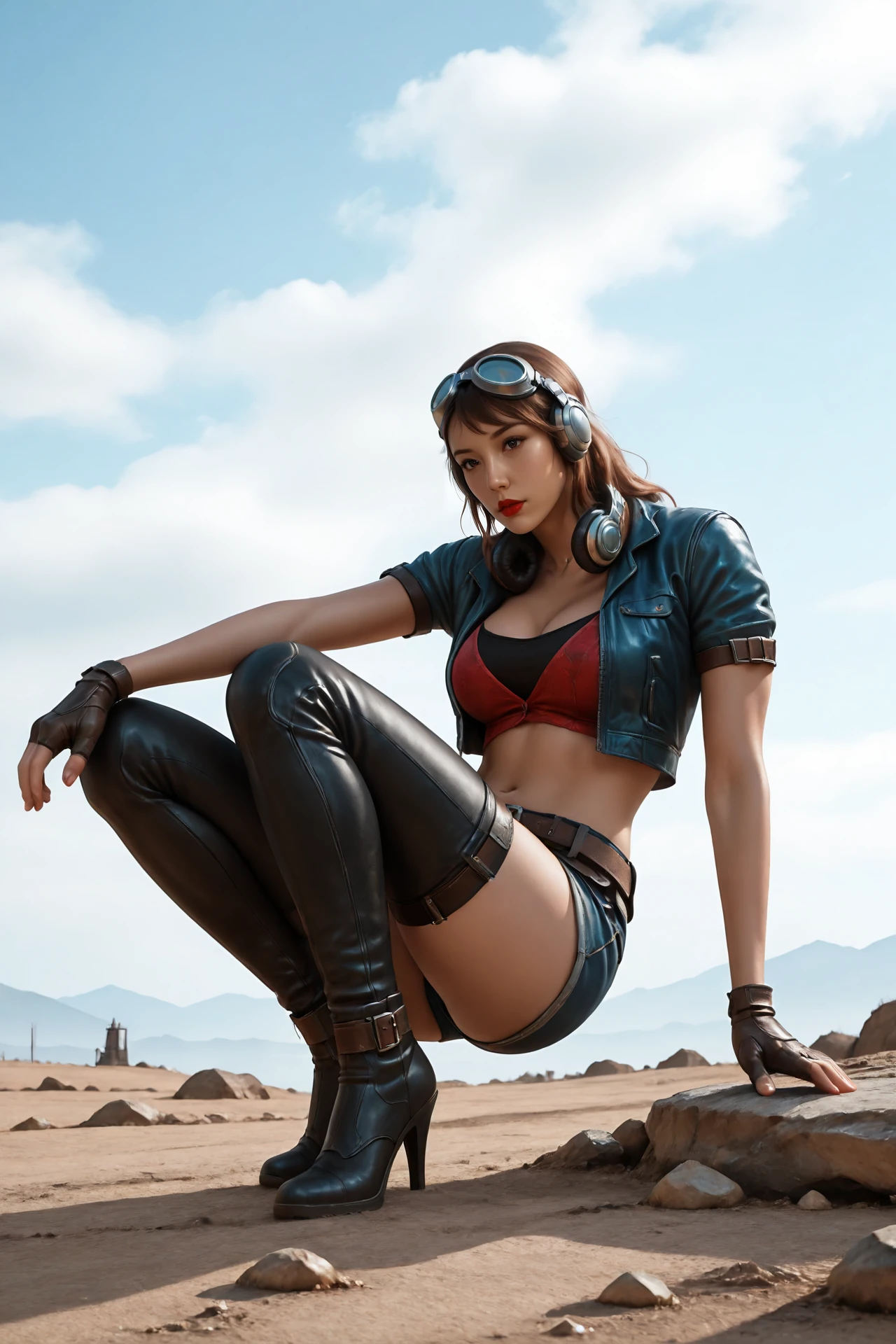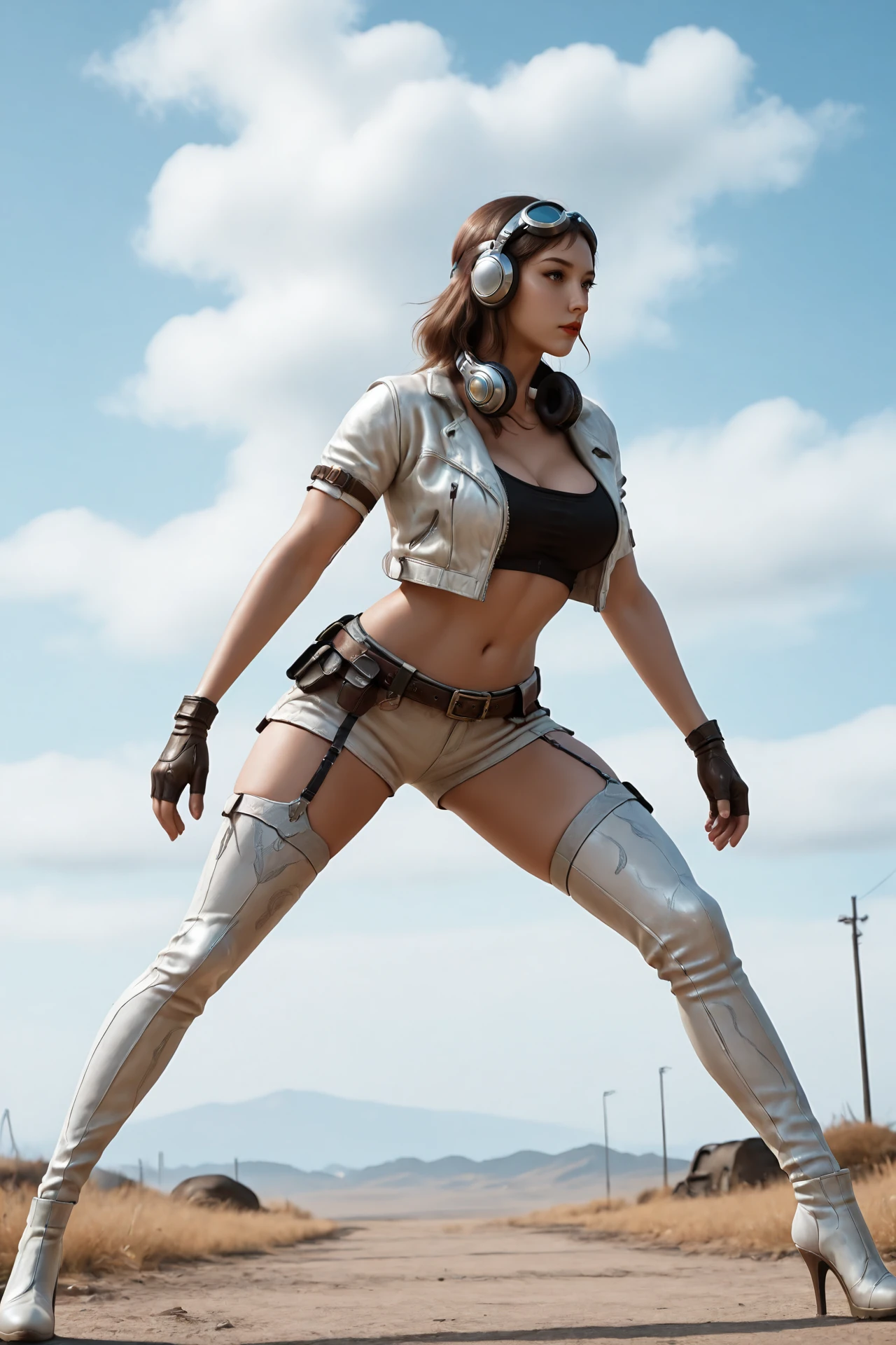 large_breasts,goggles_on_head,headphones_around_neck,midriff jacket,open_jacket,short_sleeves,knotted top,arm_belt,gloves,shorts,belt,garter_straps,thighhighs, boots,high_heels,