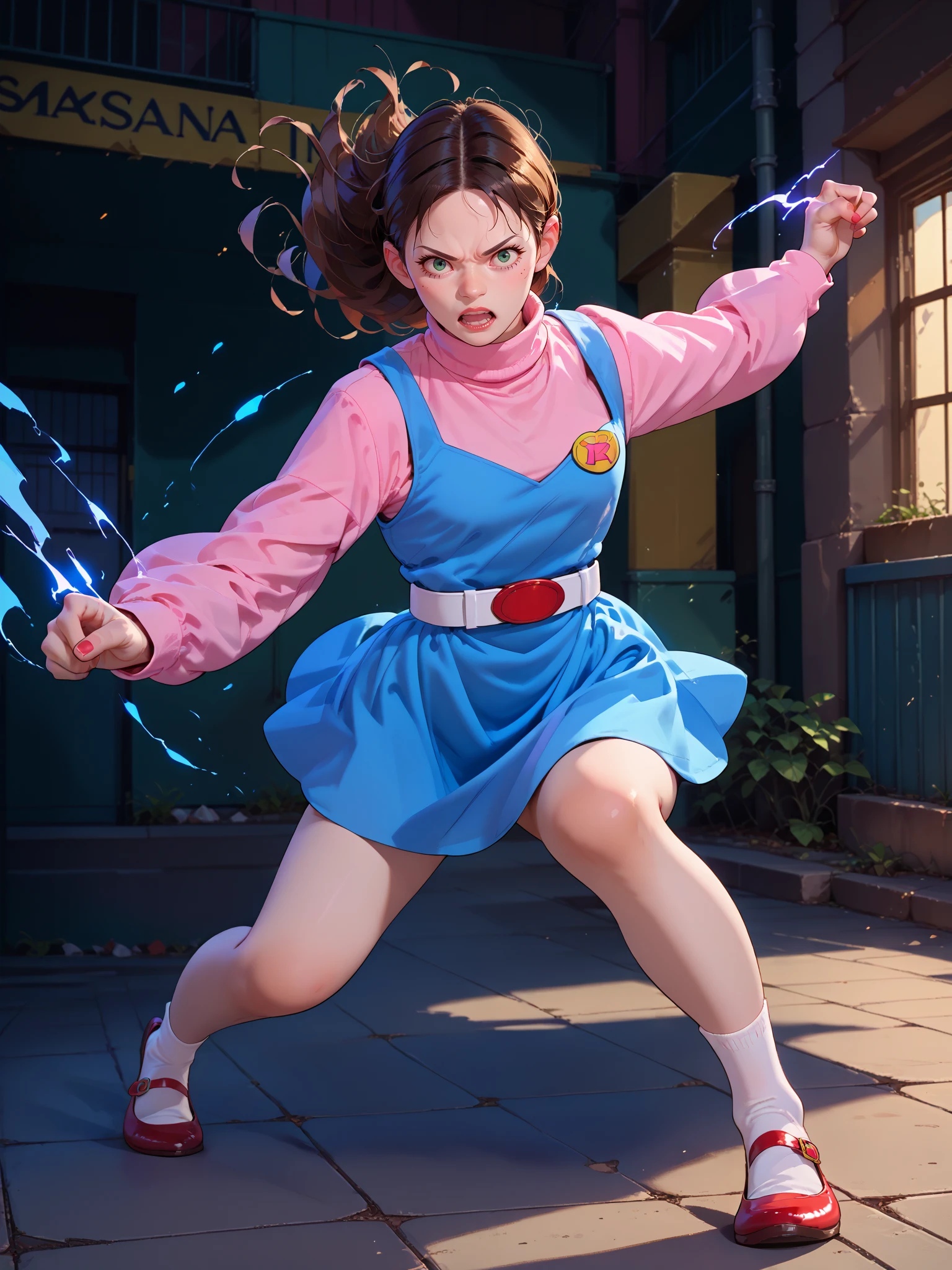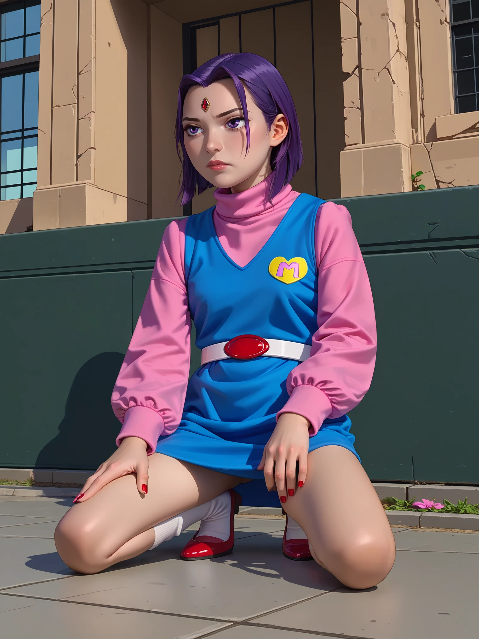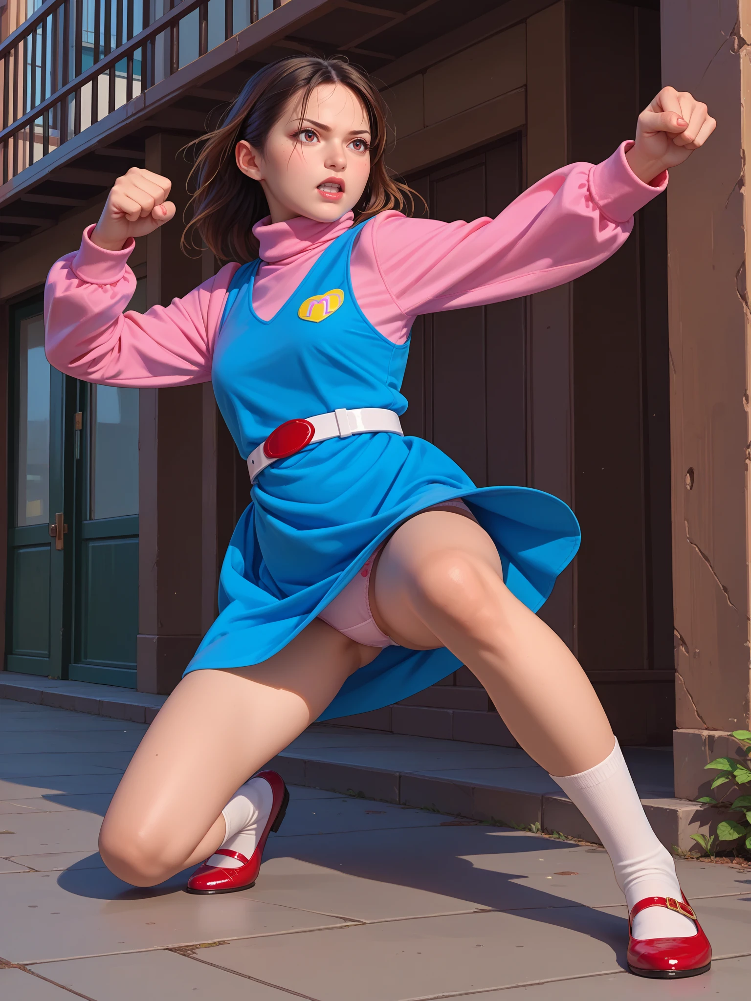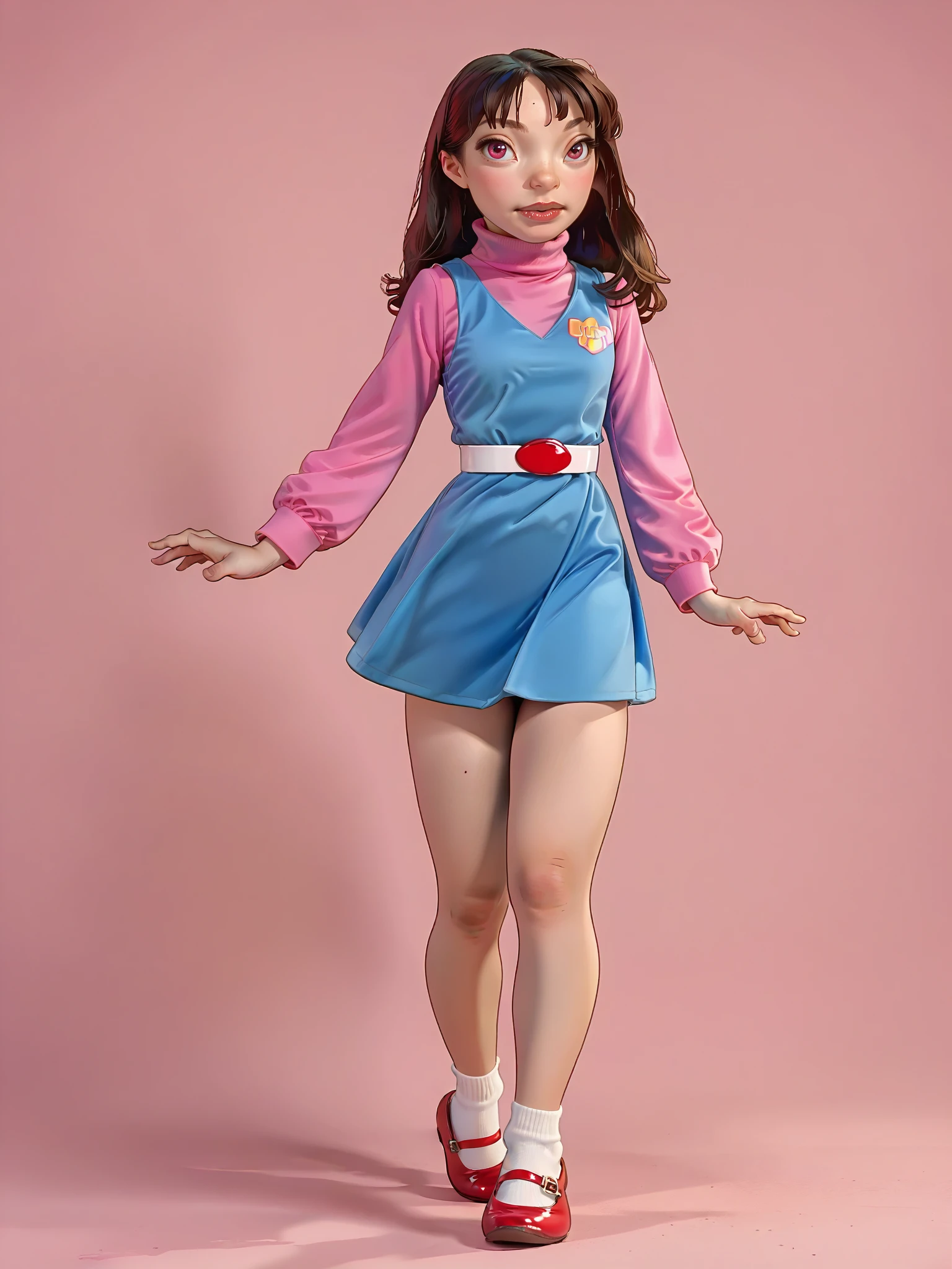 Refiners: blue dress, pink shirt, long sleeves, turtleneck, white and red belt, socks, red mary janes