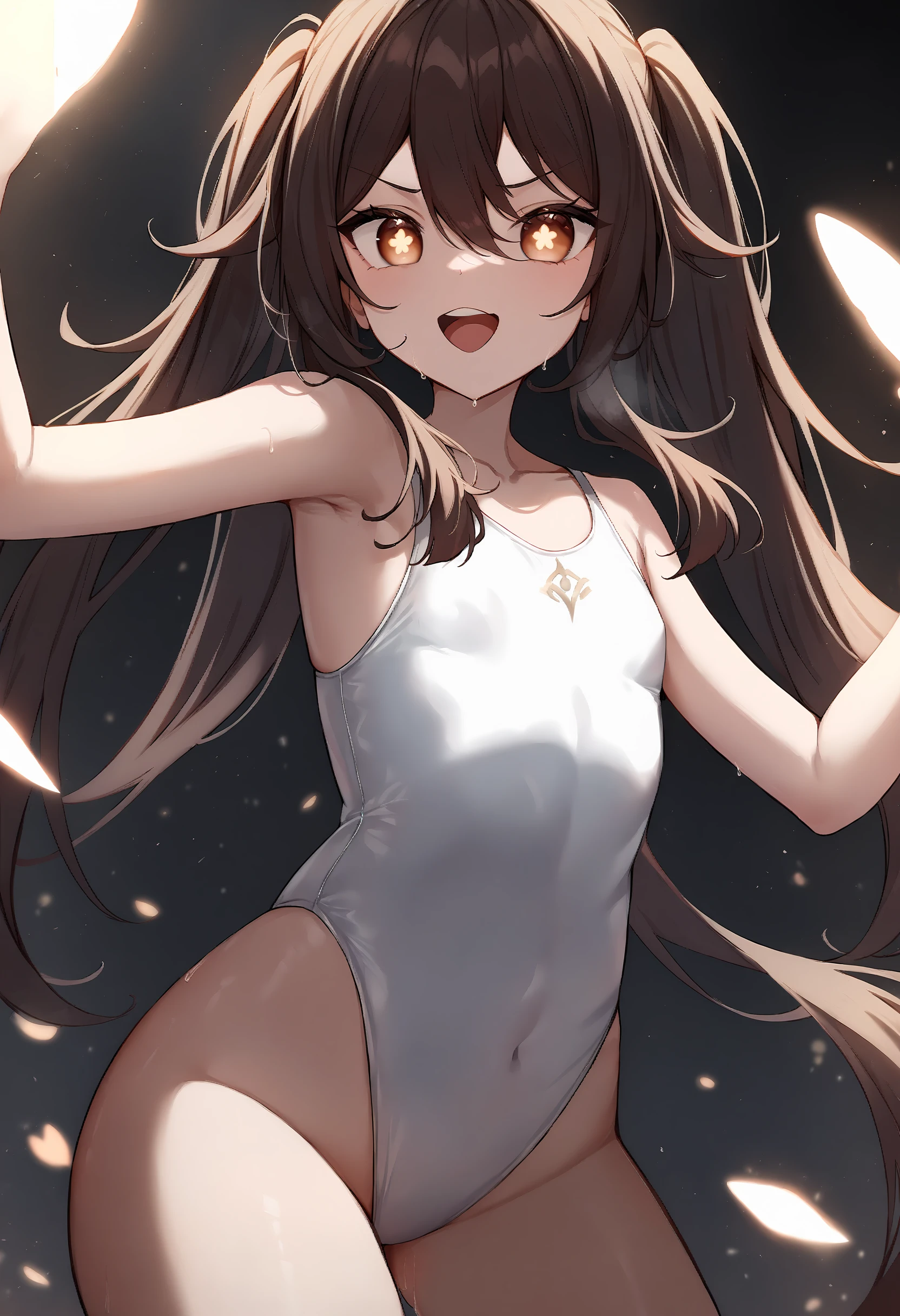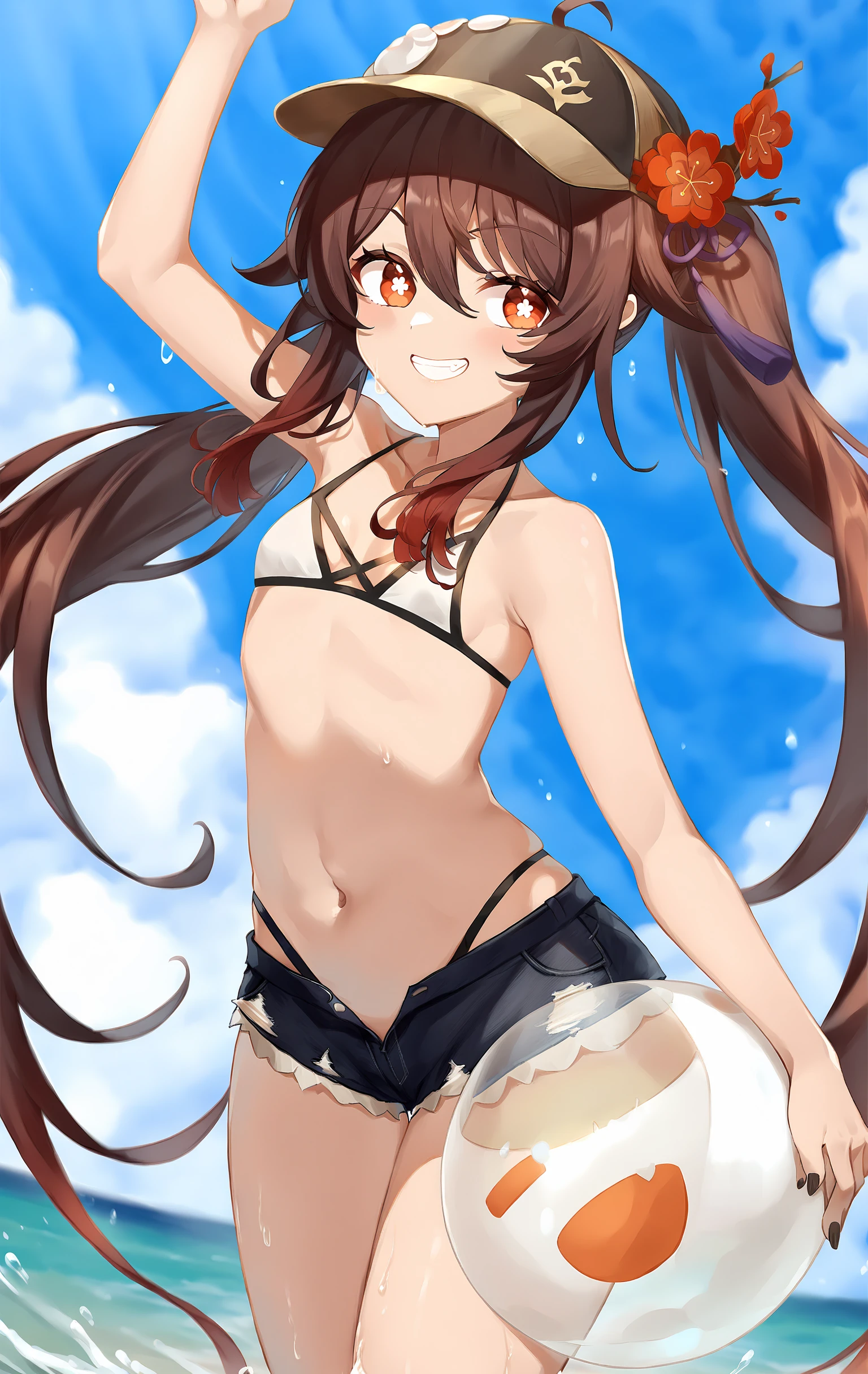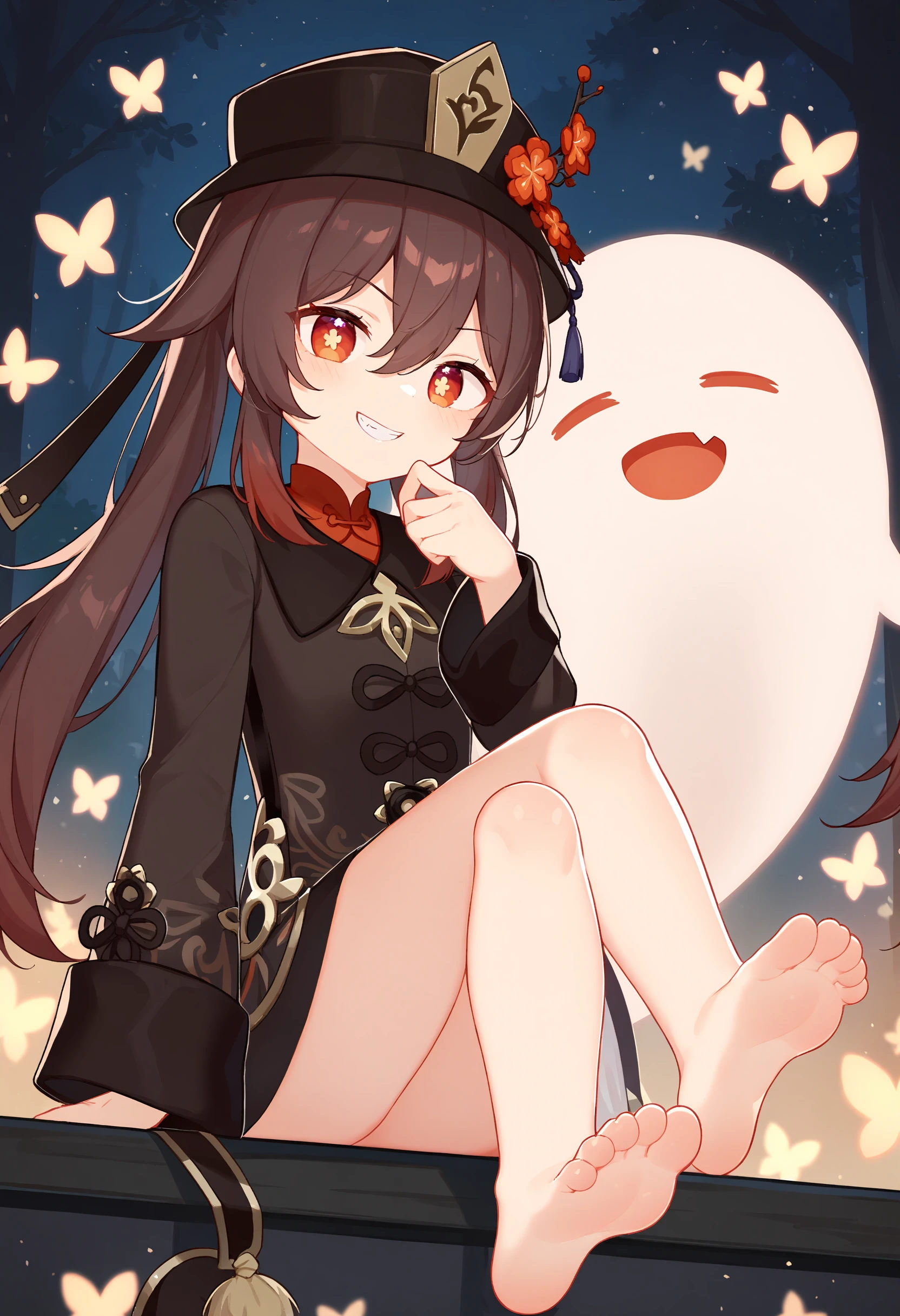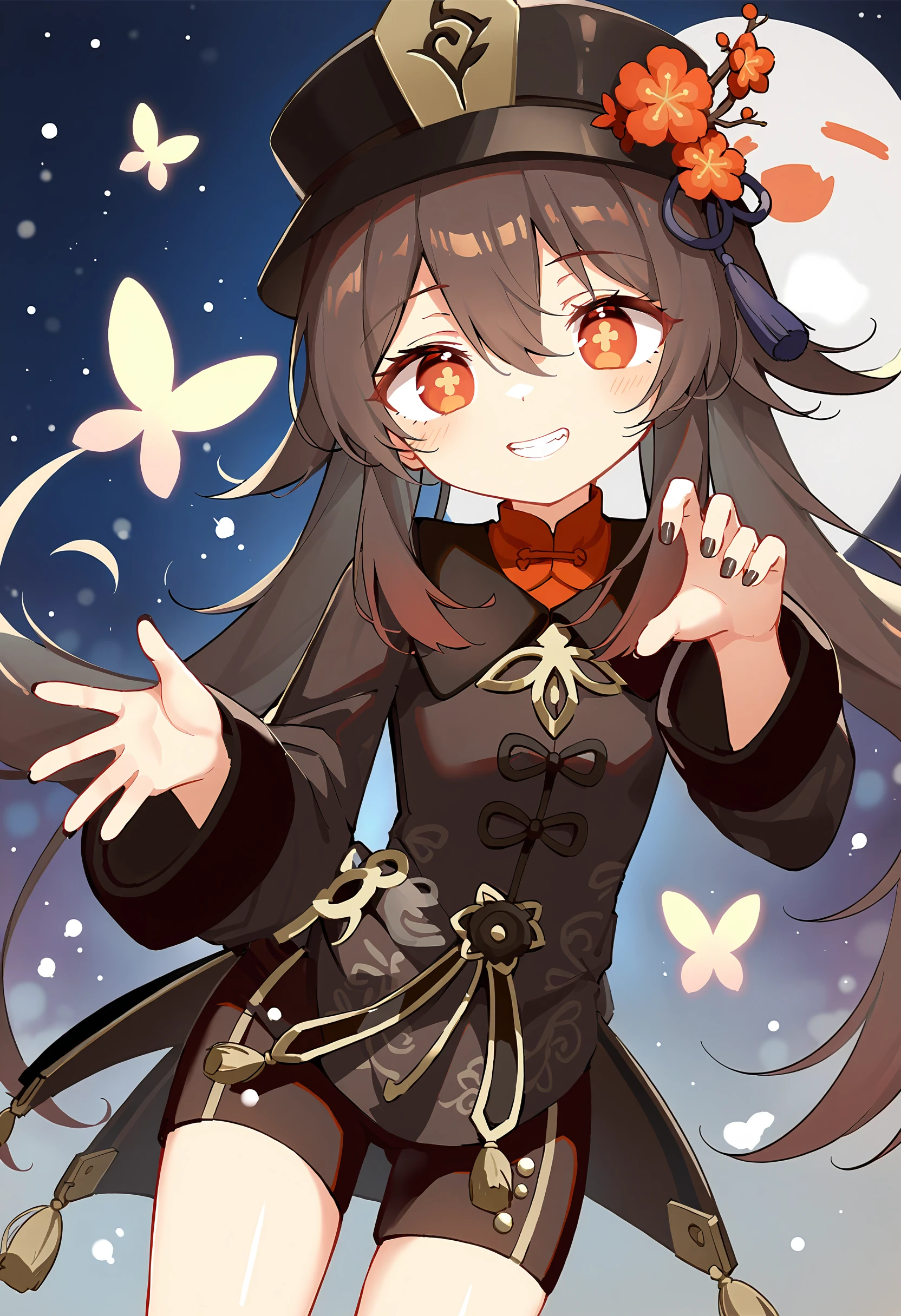HuTao,1girl,solo,hat flower,hat,symbol-shaped pupils,chinese clothes,short_shorts,white socks,black footwear,