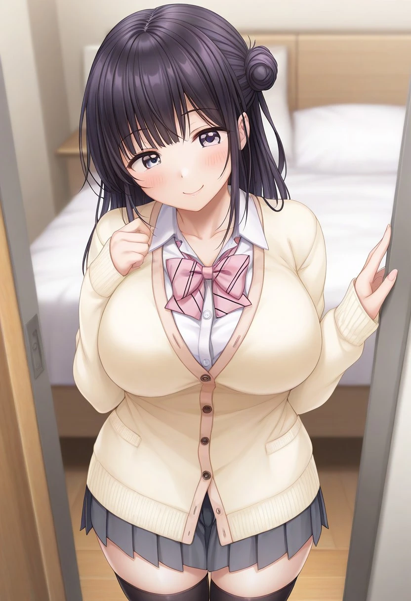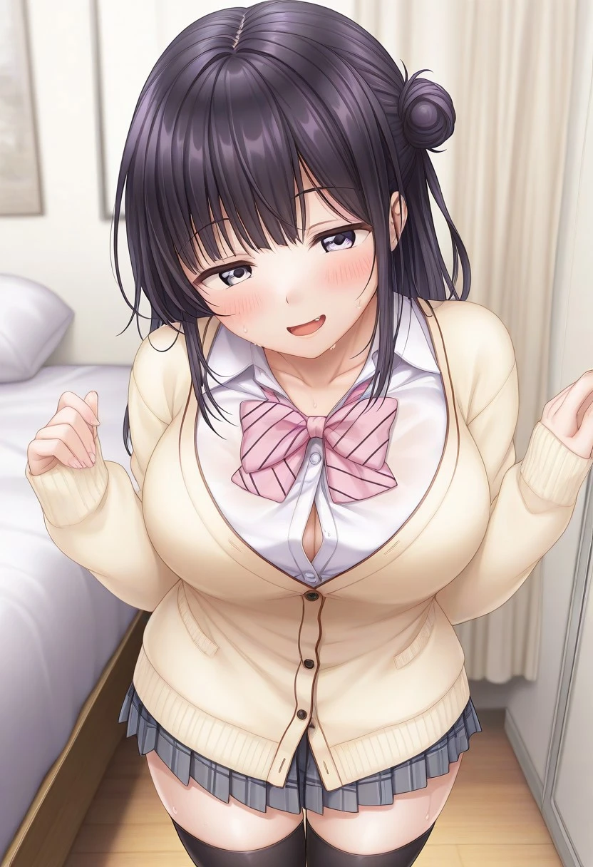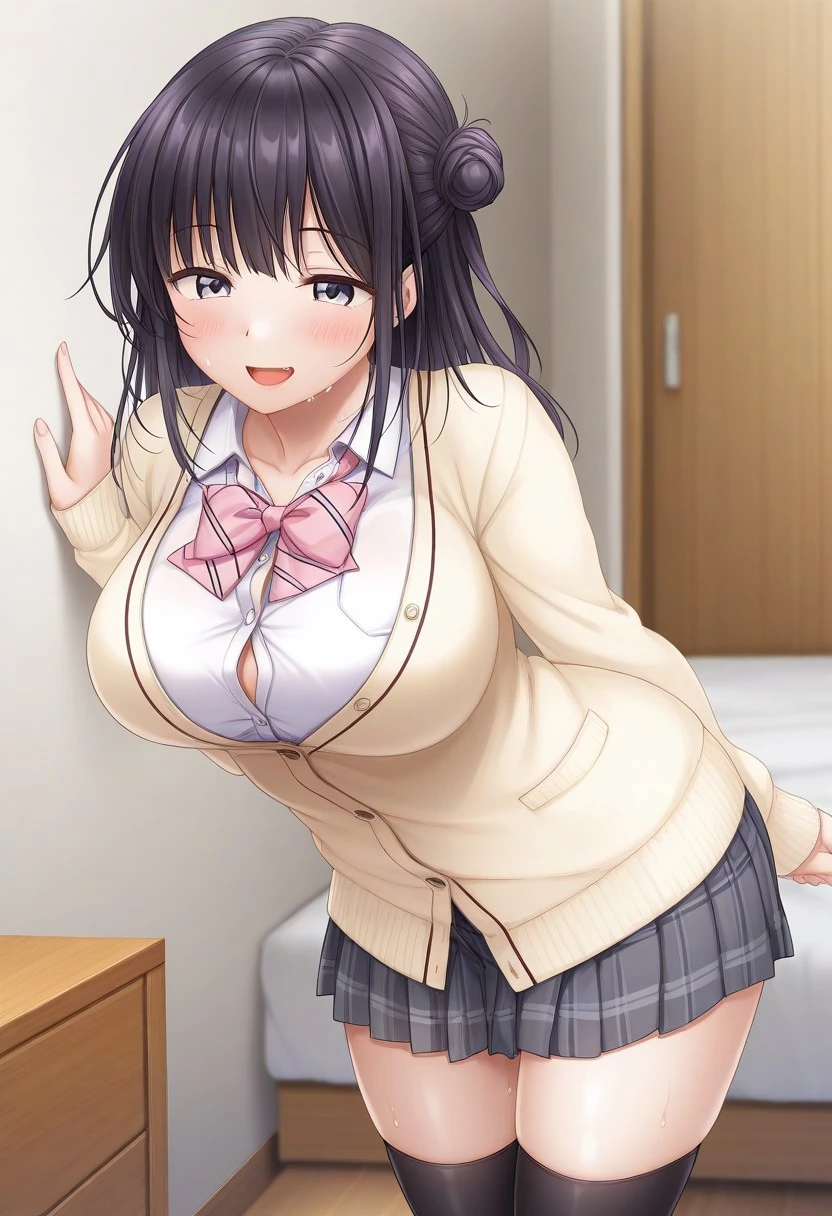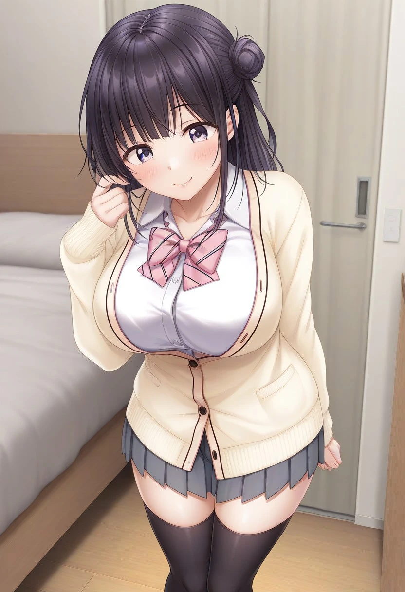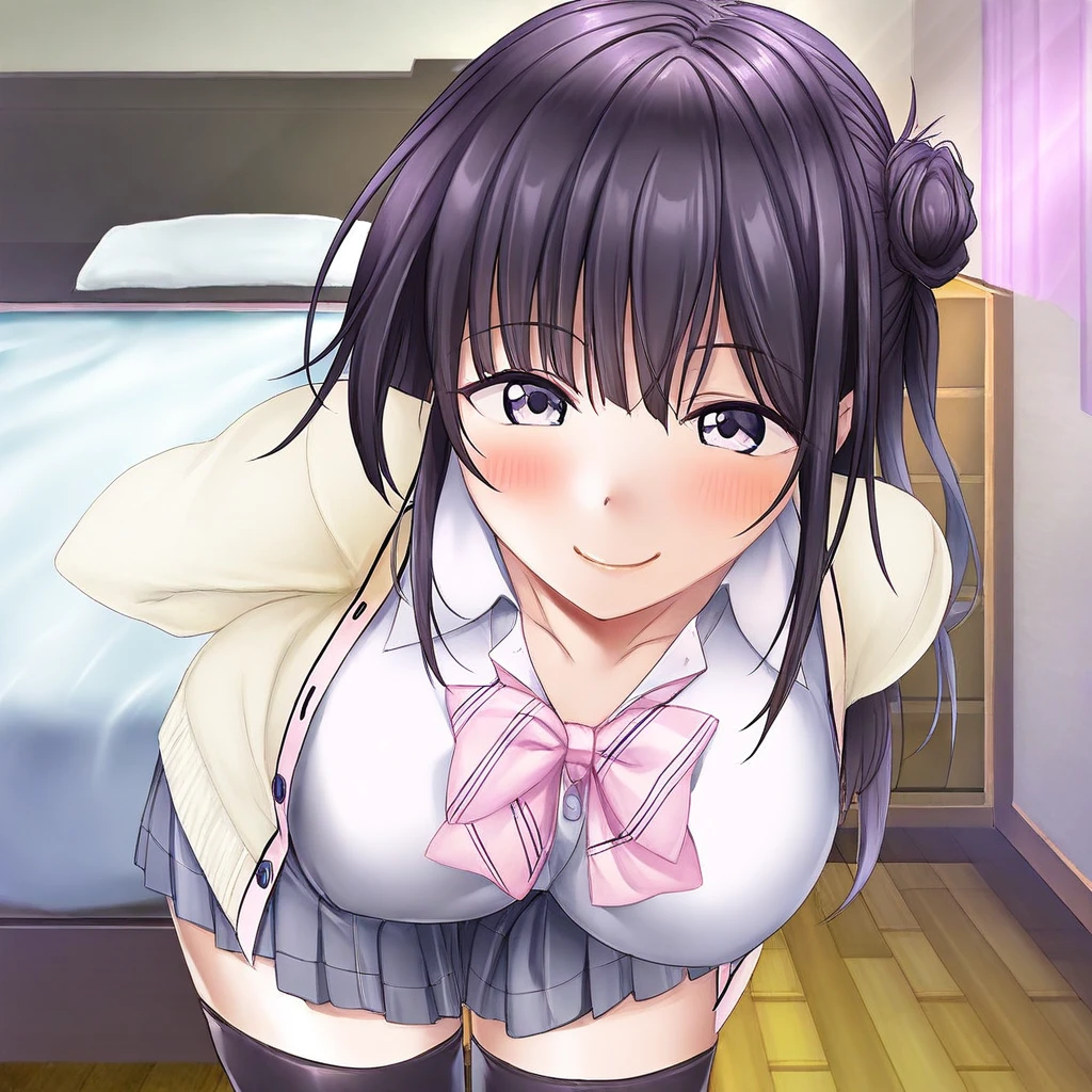 Recommend Prompt:Karin Maniwa, purple eyes, black hair, semi-long hair, single hair bun, blunt bang,