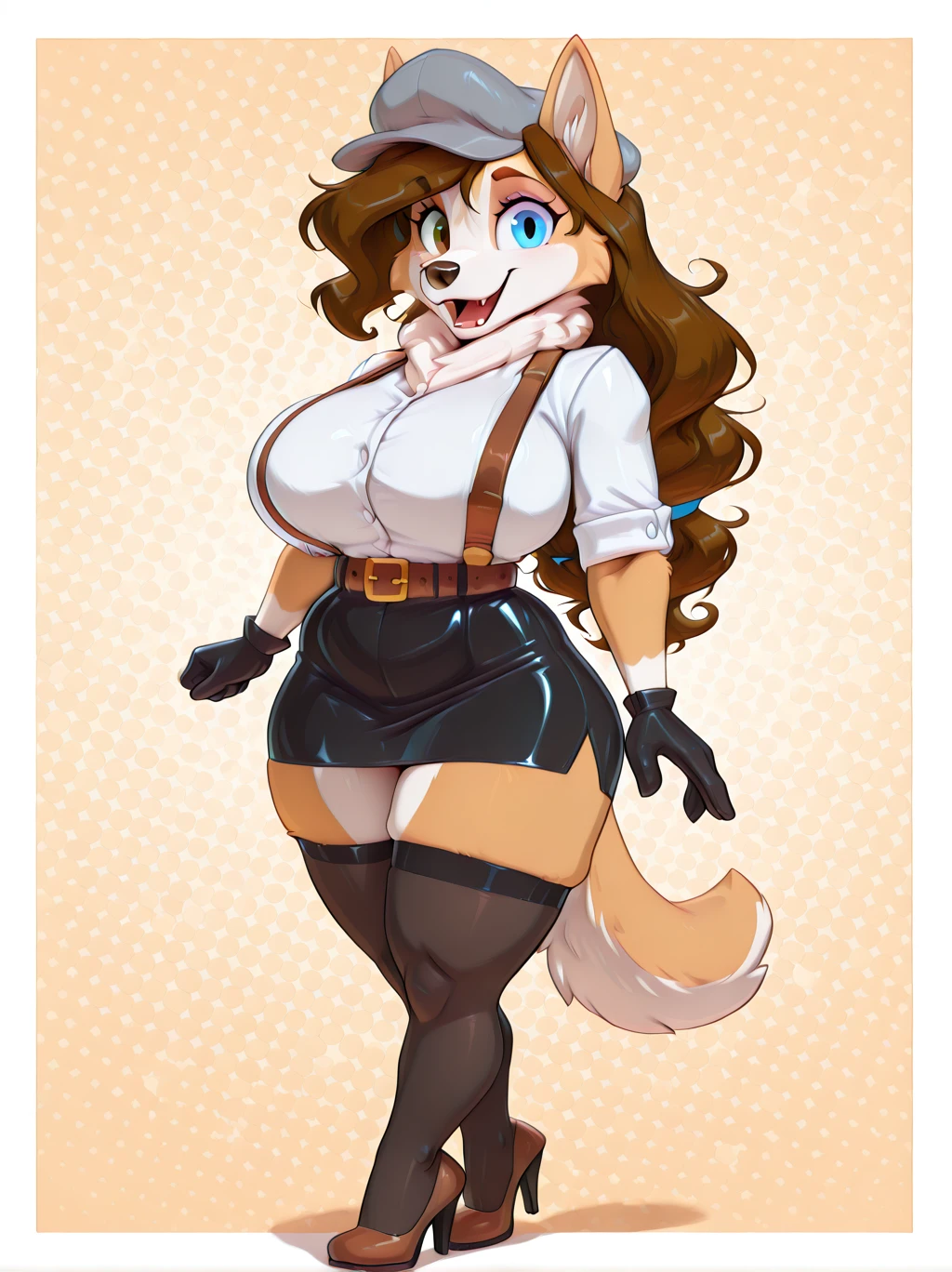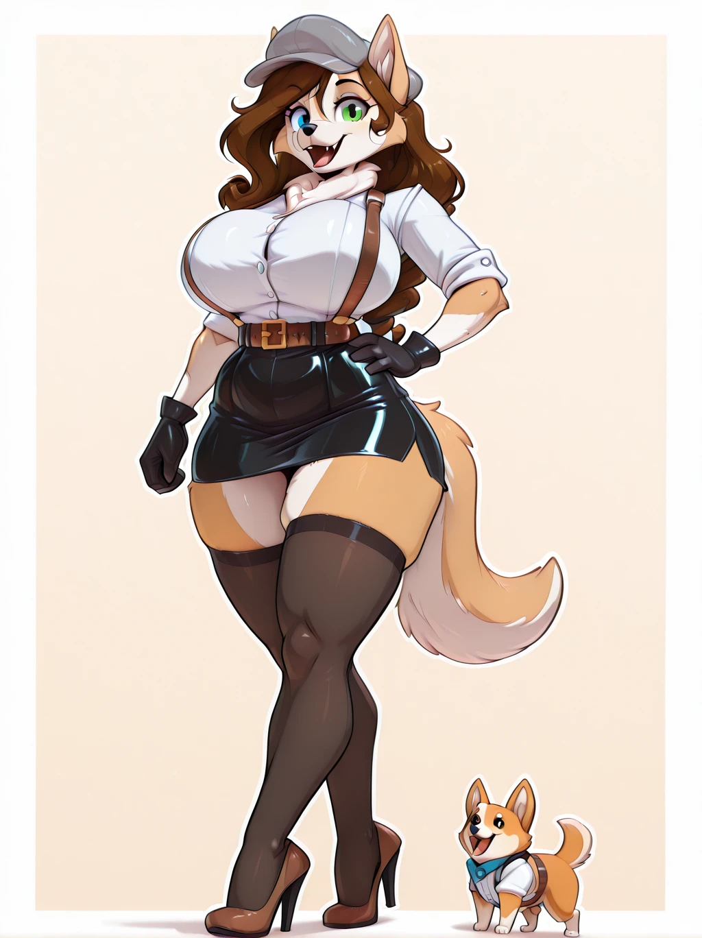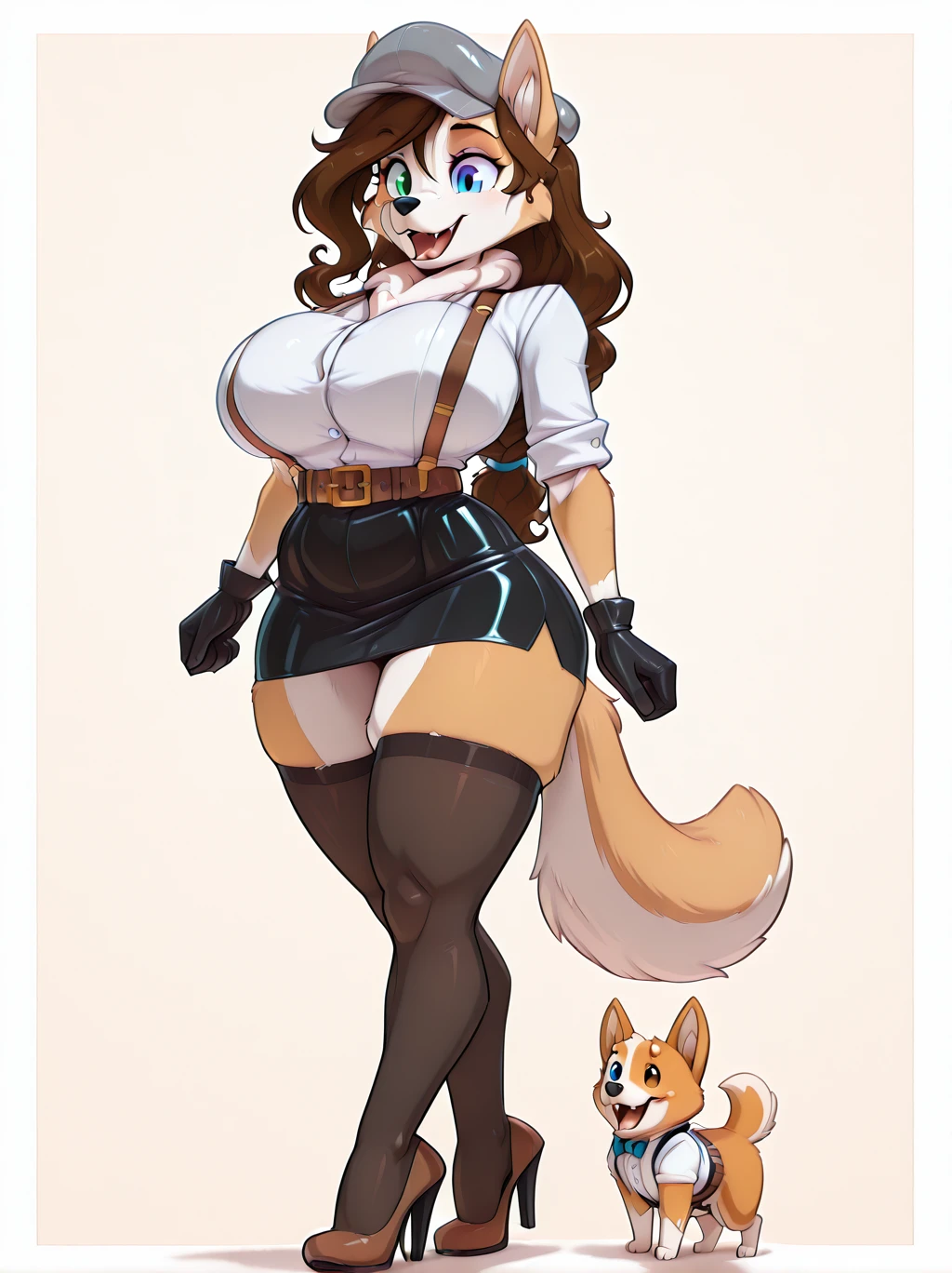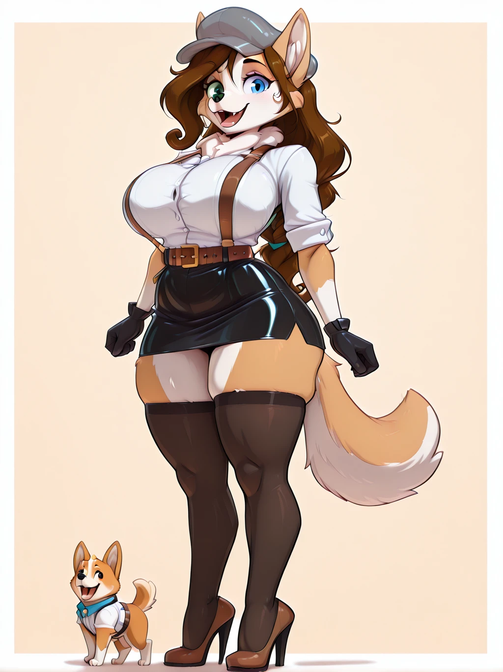(1girl, solo, 3 fingers, fewer digits, furry female, anthro, corgi, dog, canine, dog ears, dog tail, snout, animal nose, fangs, white fur, two-toned fur, brown hair, long hair, curly hair, braided, green left eye, blue right eye, heterochromia, body fur, neck tuft, , mature female, big breasts, curvy)
