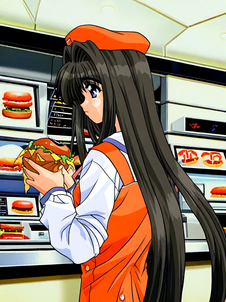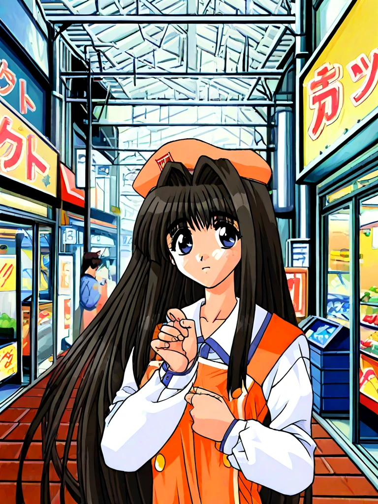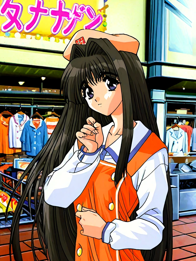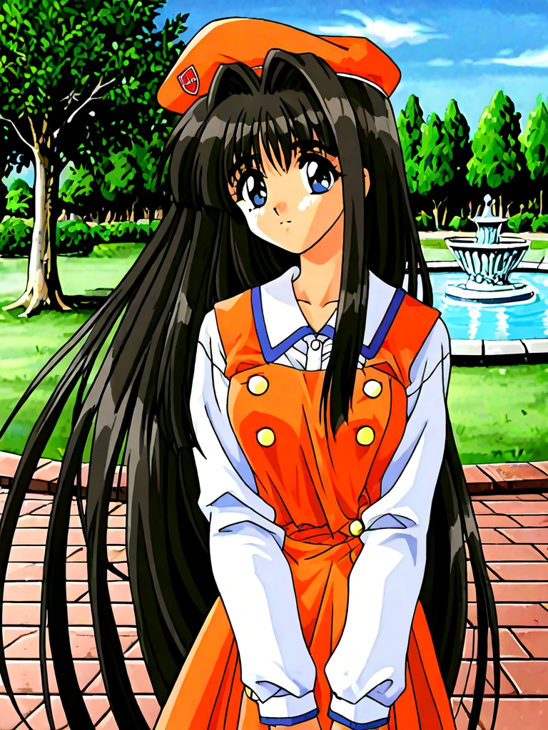higashiyama hinao, 1girl, petite, skinny, blue eyes, black hair, hair intakes, very long hair, long sleeves, overall skirt, orange skirt, white shirt, medium breasts, buttons,