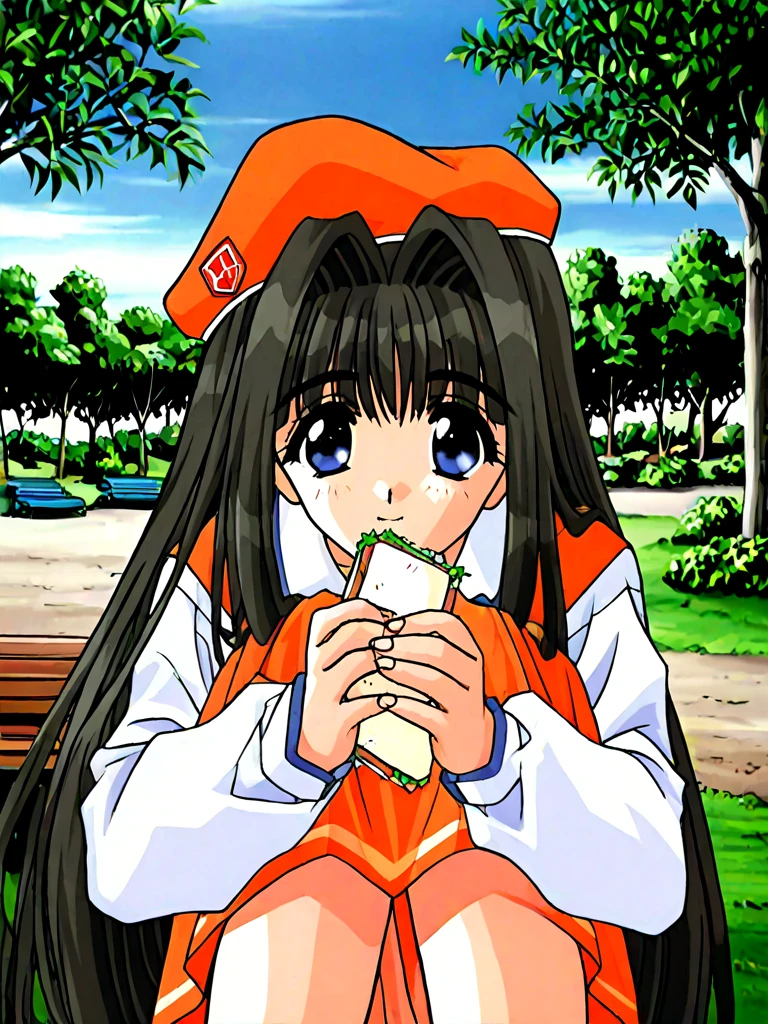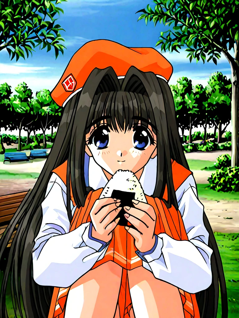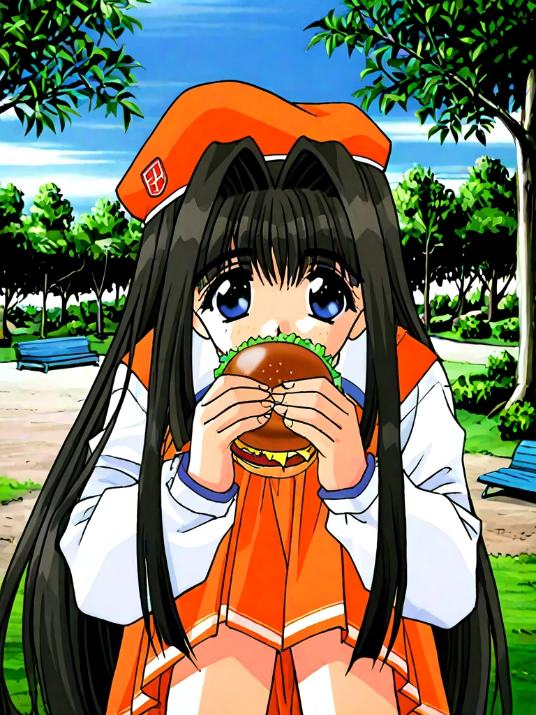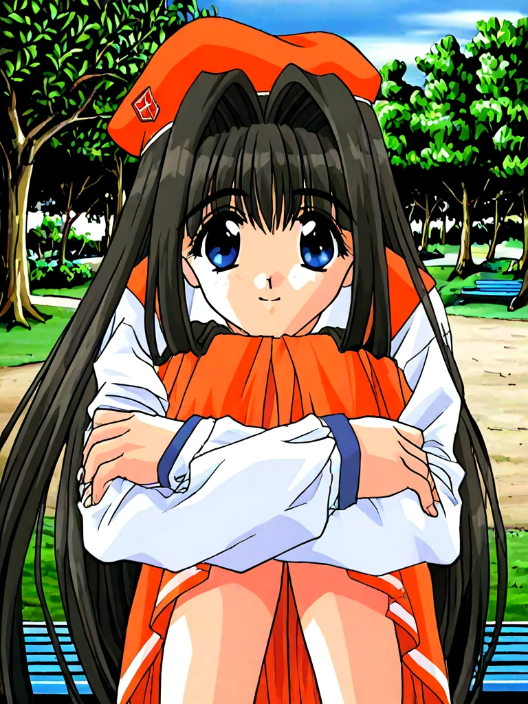 higashiyama hinao, 1girl, petite, skinny, blue eyes, black hair, hair intakes, very long hair, long sleeves, overall skirt, orange skirt, white shirt, medium breasts, buttons,
