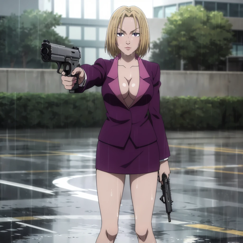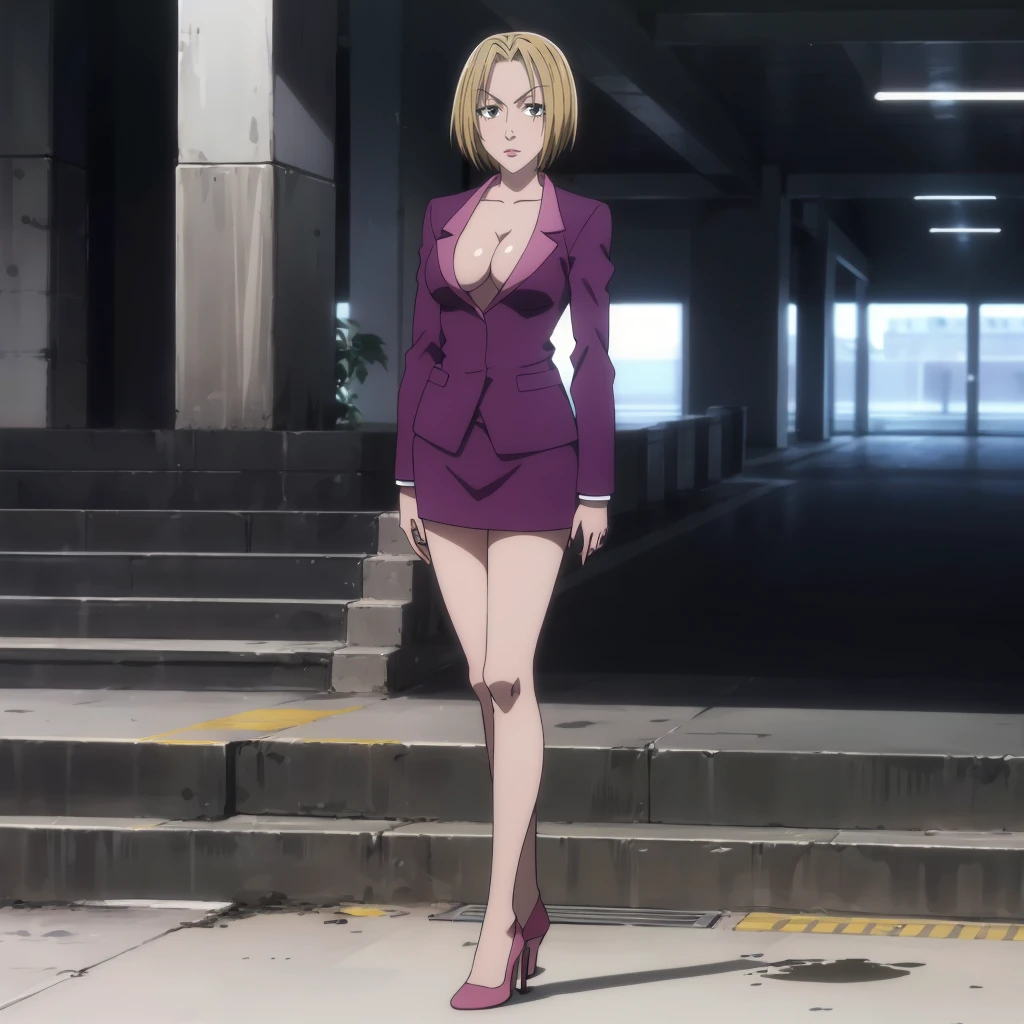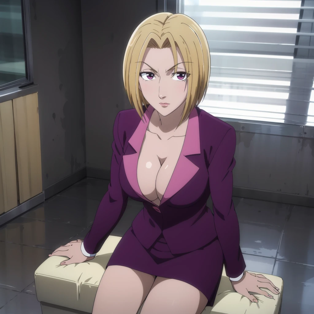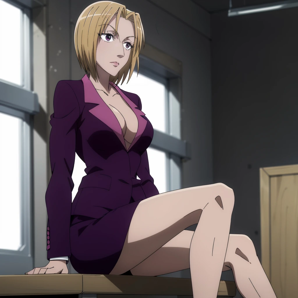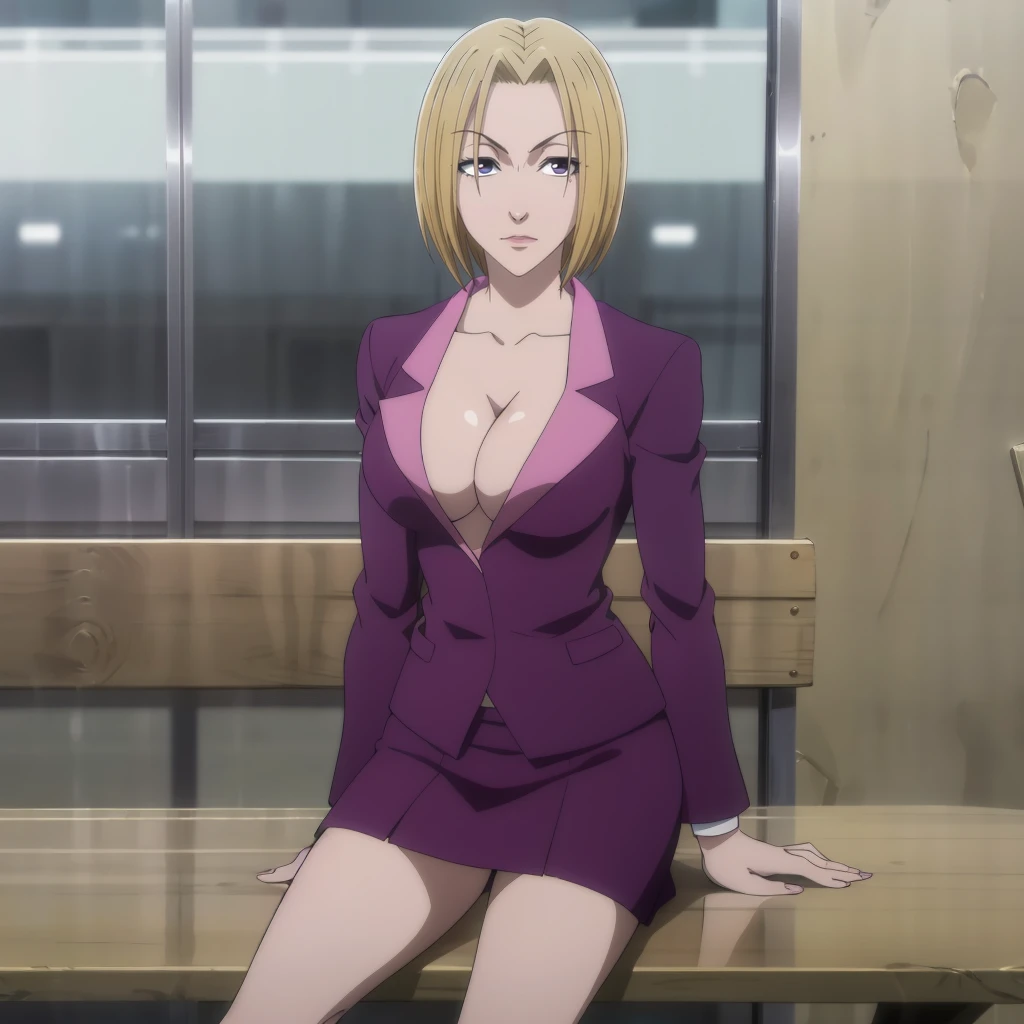 purple skirt suit,cleavage,