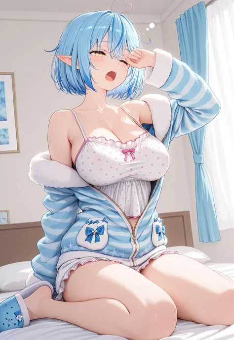 lamyloungewear, short hair, bob cut, blue jacket, off shoulder, partially unzipped, fur trim, pajamas, frilled camisole, polka dot camisole, white skirt, blue slippers
