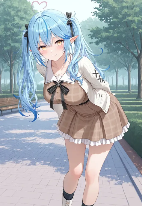 Yukihana Lamy, elf, pointy ears, blue hair, streaked hair, heart ahoge, yellow eyes,