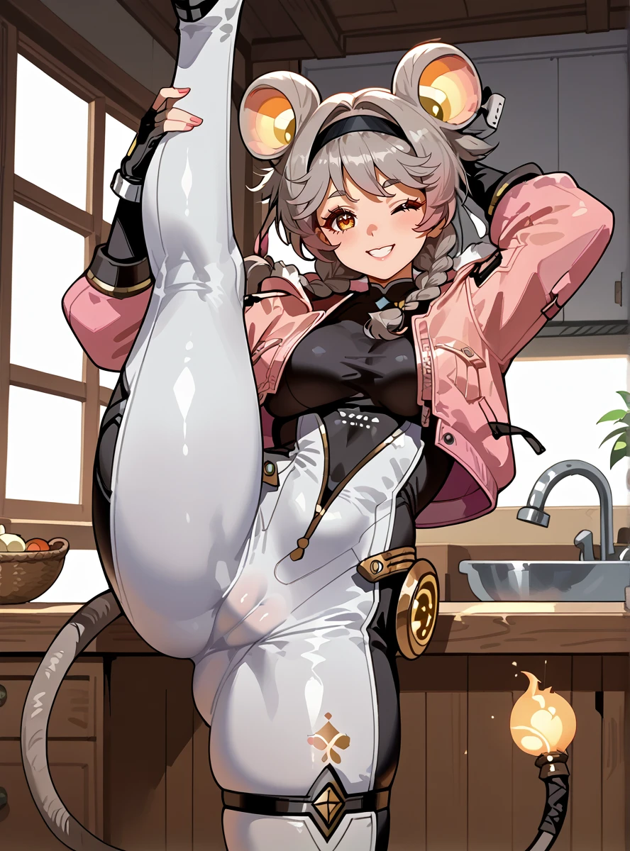 1girl, solo, jacket, braid, gloves, twin braids, animal ears, fingerless gloves, bodysuit, tail, mouse tail, smile, mouse ears, pink jacket, grey hair smile thick thighs, large breasts,