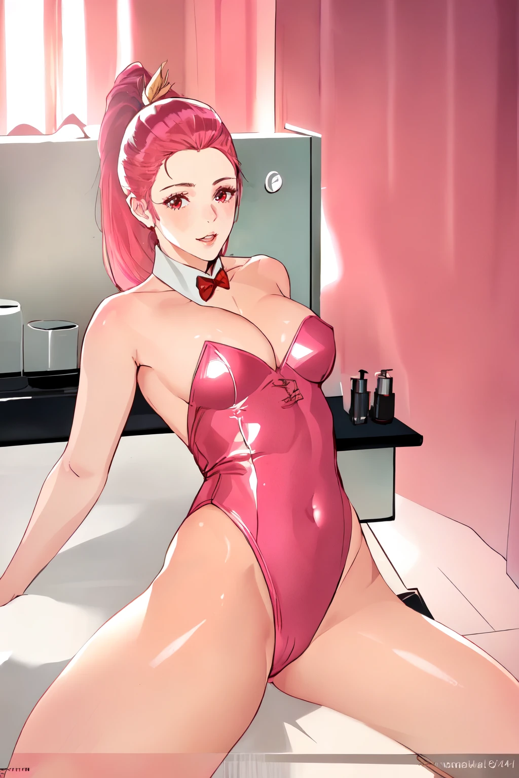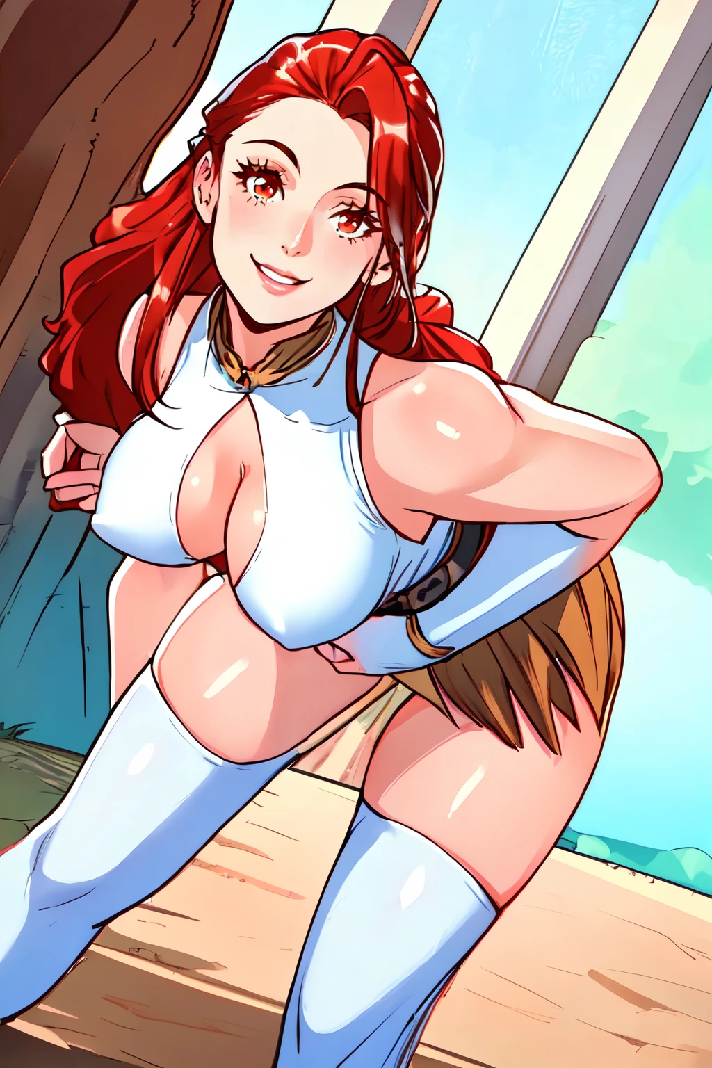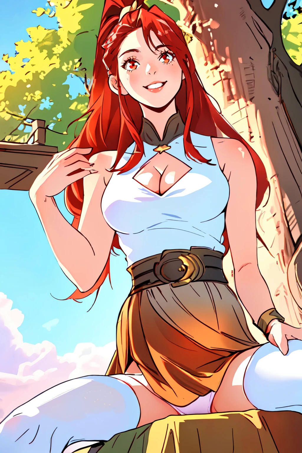 1girl, very long hair, ponytail, white top, sleeveless, feathers, cleavage cutout, belt, skirt, thighhighs