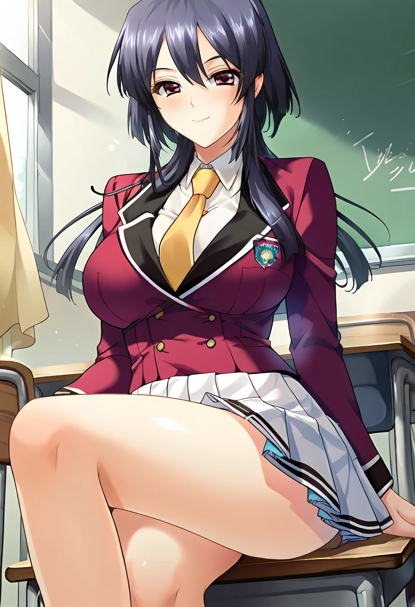 School Outfit: "school uniform, red blazer, white skirt, pleaded skirt, yellow necktie"